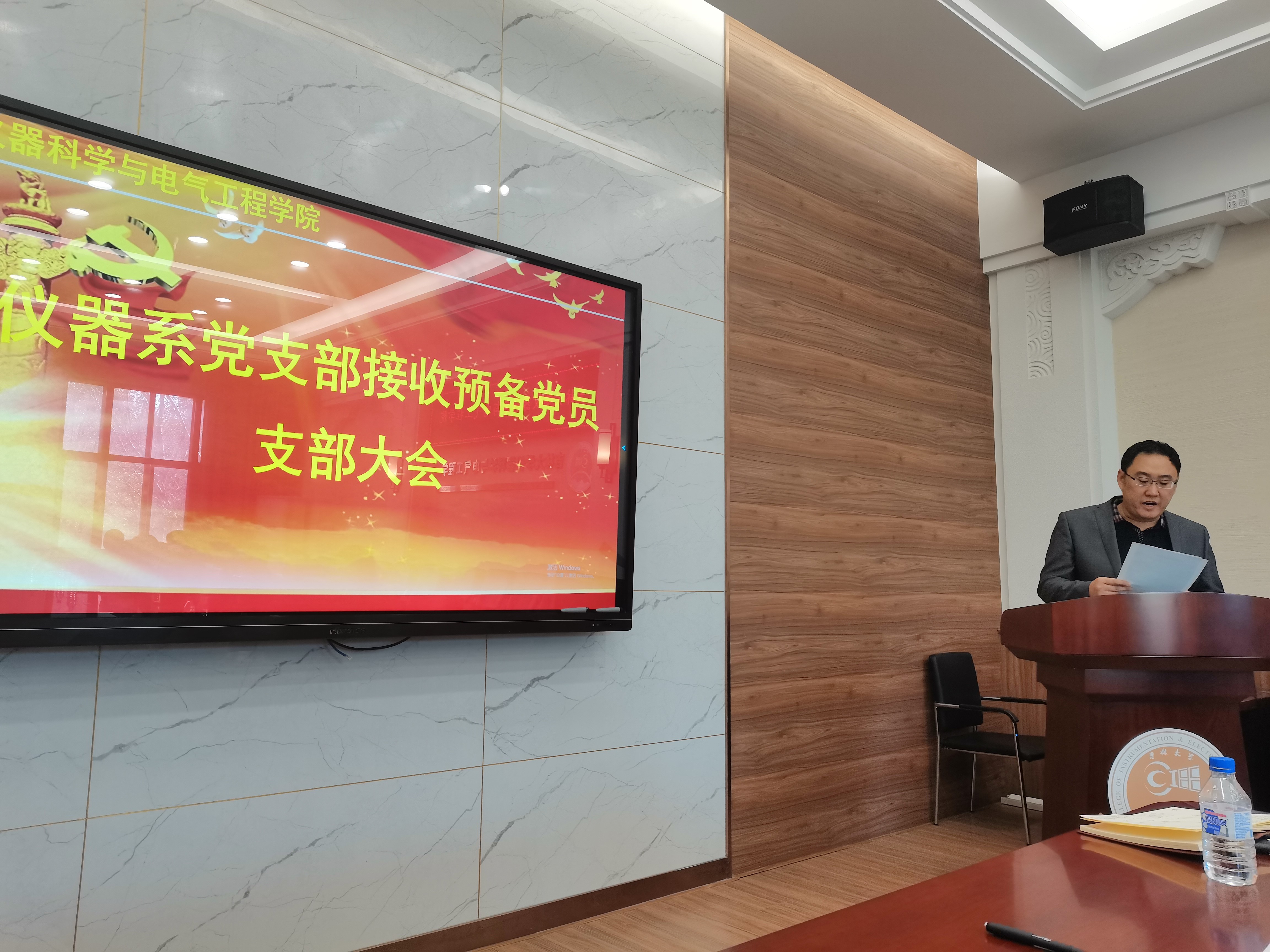 仪器系党支部在地质宫330召开支部党员大会,专题讨论关于接受张帆同志为预备党员的工作。党支部16名正式党员参会,会议由党支部书记陈晨同志主持,学院党委书记邱增凯同志参会。