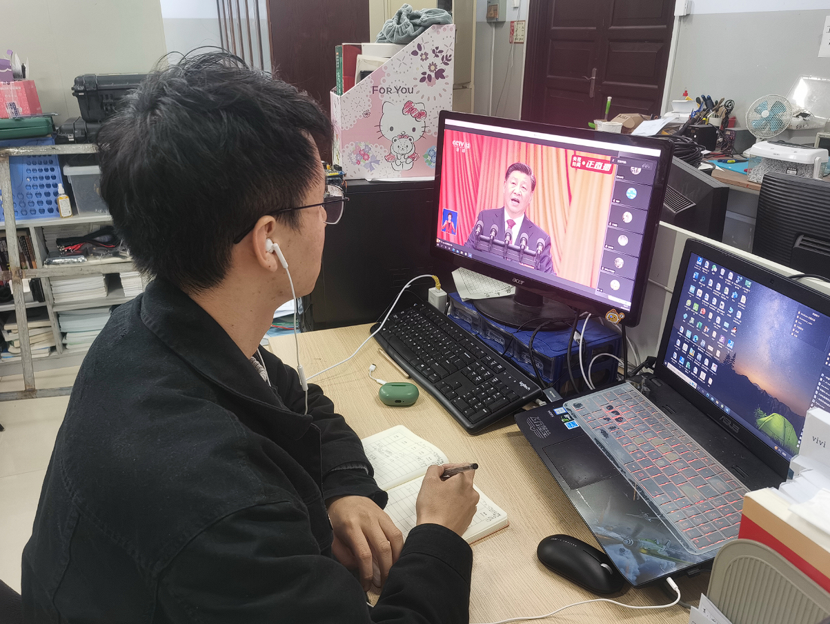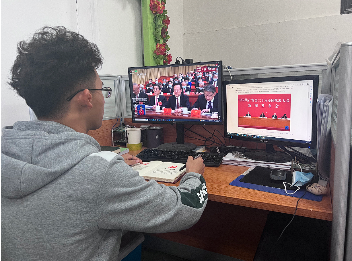 所有参会的研究生聚精会神,认真收听收看,仿佛置身于大会现场聆听报告,时而激动,时而自豪,表现出了对党的无限热爱和对党的第二十次代表大会的热切期待。