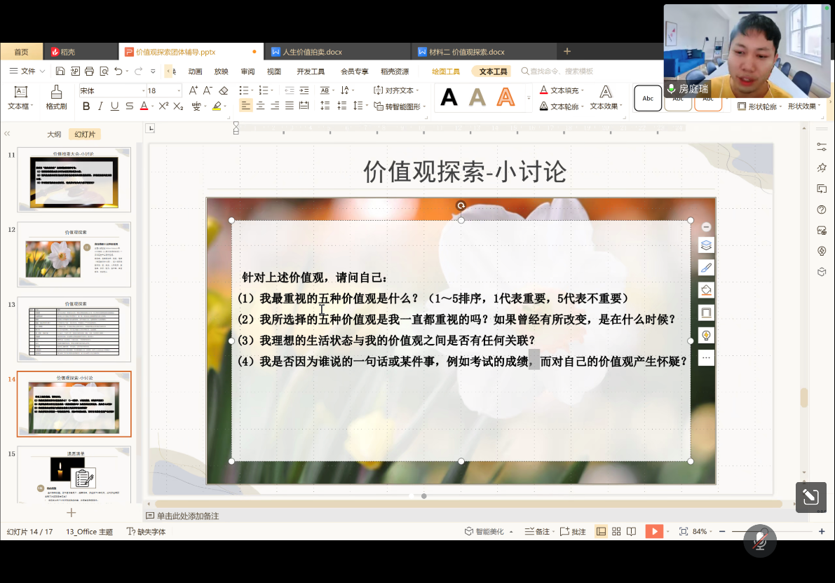 团体心理辅导是在团体的情境下进行的一种心理辅导形式,它是通过团体内人际交互作用,促使个体在交往中观察、学习、体验,认识自我、探索自我、调整改善与他人的关系,学习新的态度与行为方式,以促进良好的适应与发展的助人过程。本次活动过程中,主持人首先开展了“交际圈”活动进行热身,接下来以“火灾中救猫还是名画”为辩题启发同学进一步思考价值观的意义,紧接其后以“价值拍卖大会”与“遗愿清单”活动让大家进一步辨明自身所想澄清自我价值观,明晰未来方向,最后让大家以三个词语总结参与活动体验与收获。活动结束后,带领者就活动流程进行了复盘总结,总结了优势经验,反思和优化了细节问题,进一步完善了活动方案。