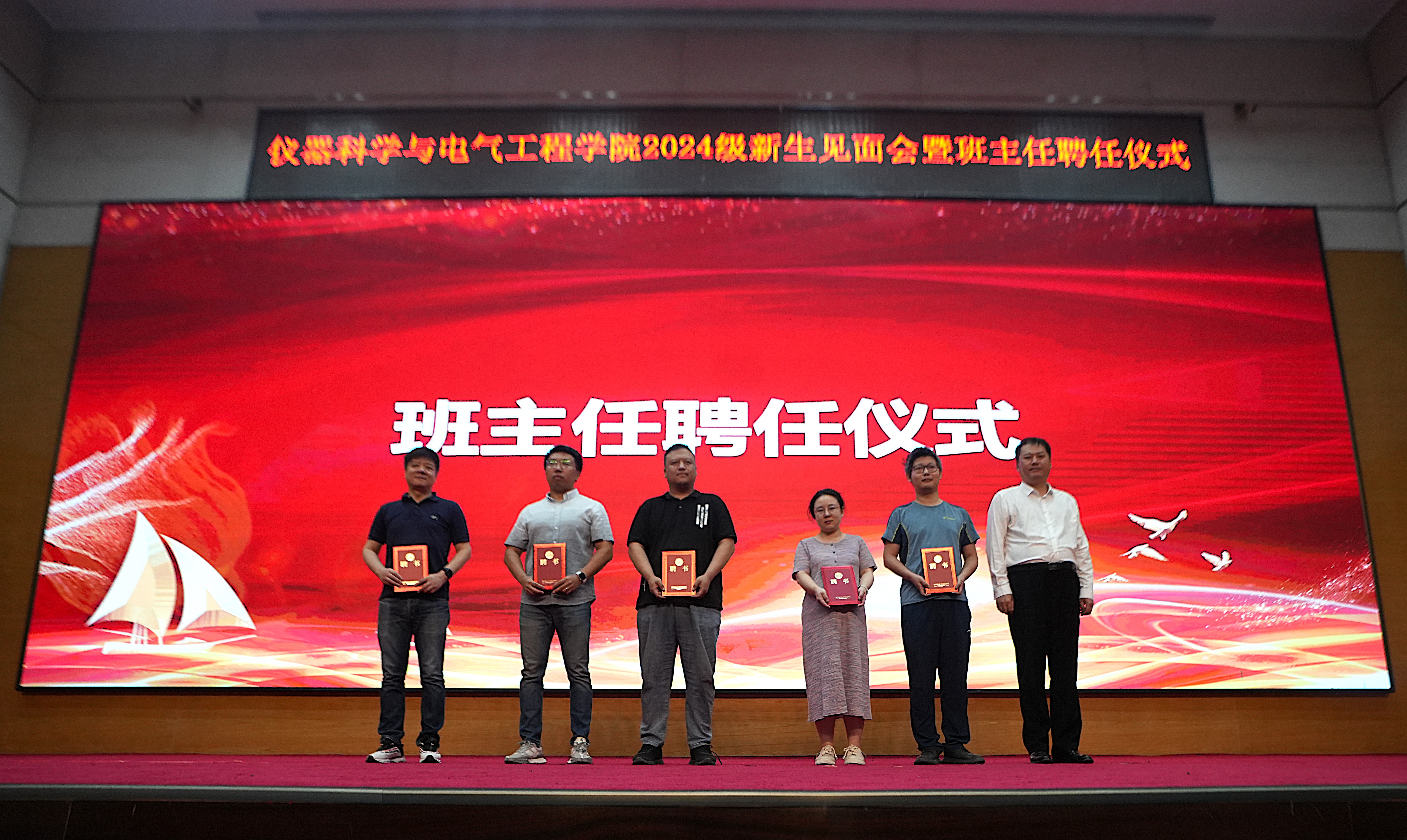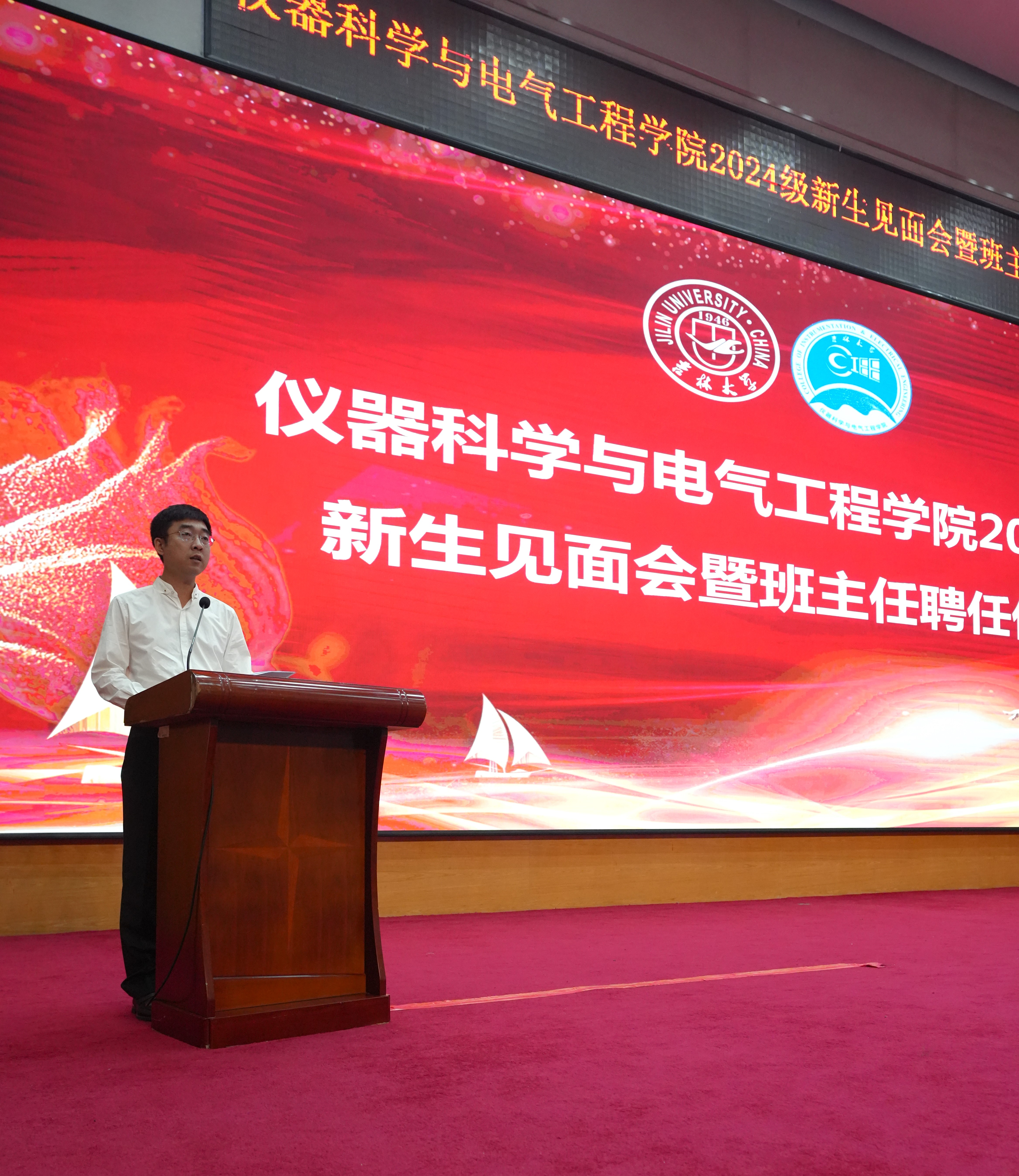 会议在雄壮的中华人民共和国国歌声中拉开了帷幕。首先进行的是班主任聘任仪式,由副院长刘长胜宣读聘任决定,学院党委书记邱增凯为班主任颁发聘书并合影留念。随后新生代表王晨皓进行发言,他讲述了对大学生活的期盼,和对吉大校训、仪电精神的初见解,字里行间体现了他及新同学们对未来四年的憧憬与向往,并表示他们要以饱满的热情、昂扬的斗志与坚定的信念,来面对未来的求学之路。班主任代表张天瑜老师也对新同学们表达了期许,分享了自己从教以来的教学经验及学术成果,并勉励24级新同学要怀揣一丝不苟,精益求精的学习品质在科学的海洋中探索,同时向新同学讲述在大学里应如何学习与生活,并表达了对新生们的美好祝愿。