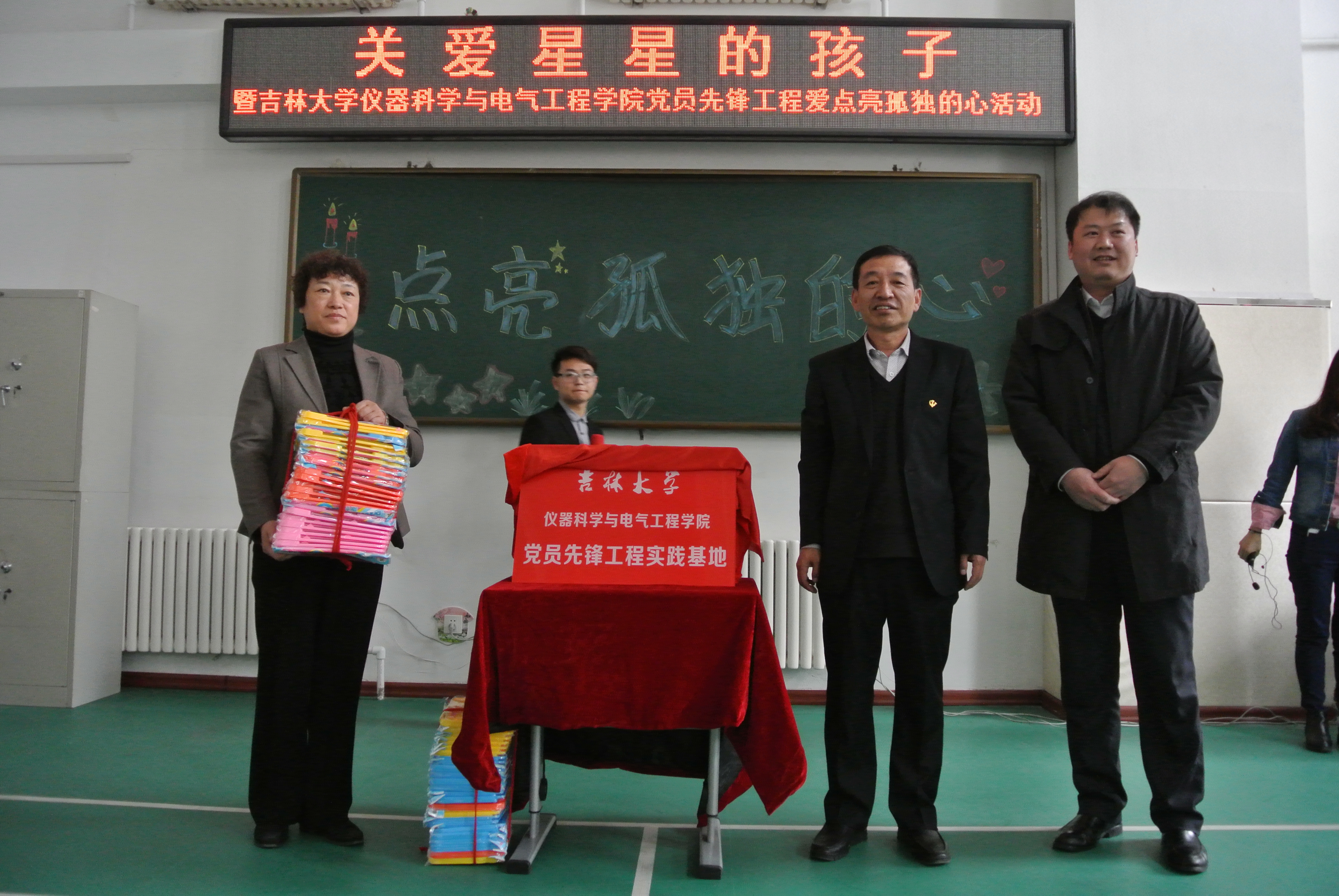 党员先锋工程实践基地揭牌;党委书记王爱民、副书记邱增凯为南关区育智学校的同学们赠送了精心准备的特制画板。