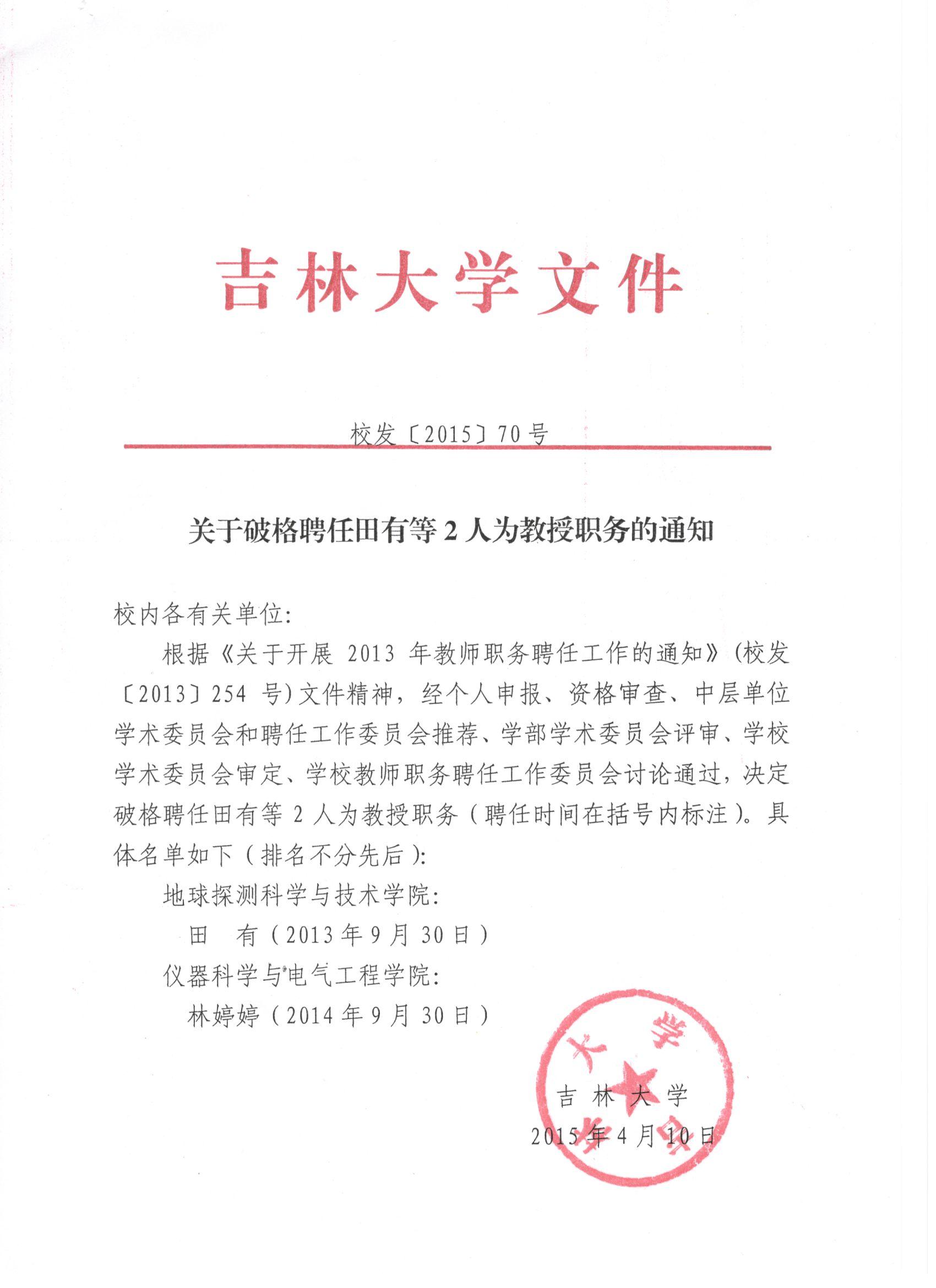 关于破格聘任林婷婷为教授的职务通知