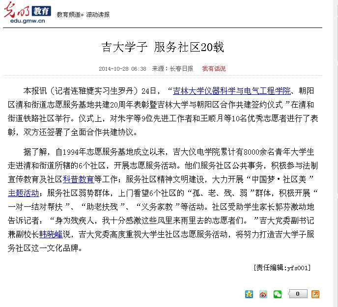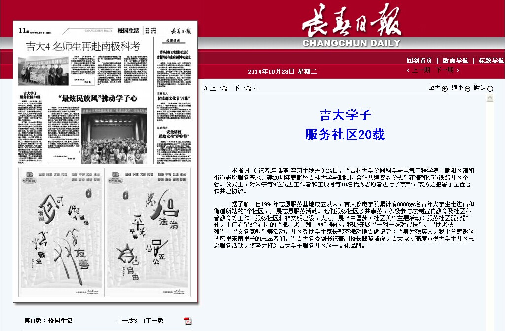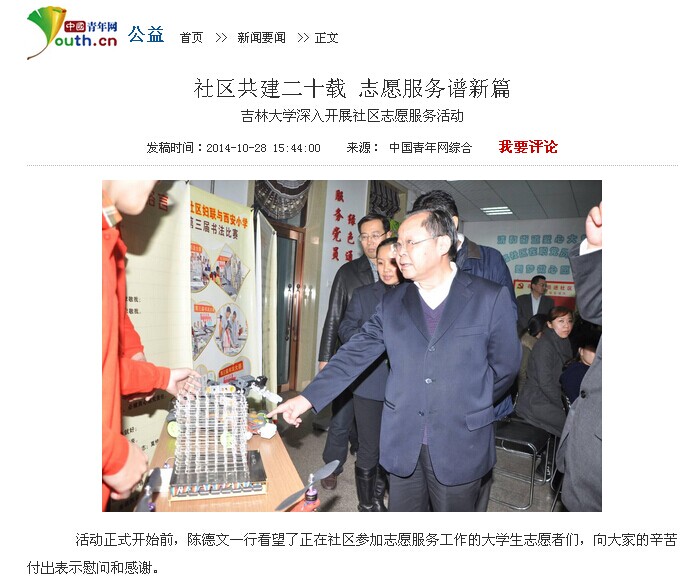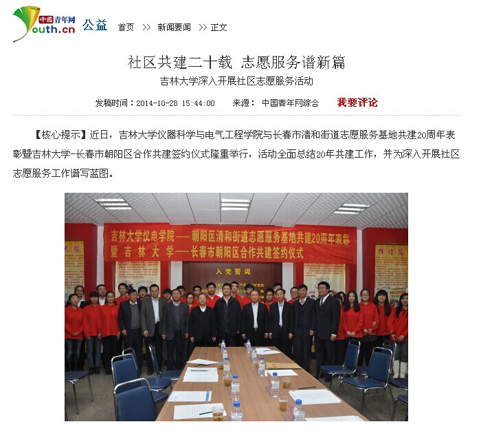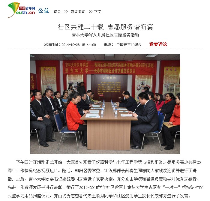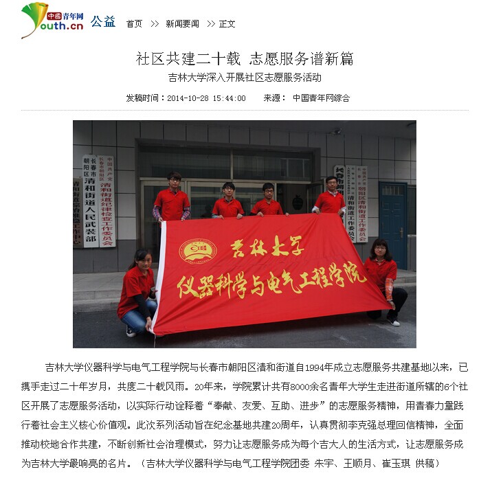 团委组织开展了以“风雨同舟二十载、志愿服务谱新篇”为主题的系列志愿服务活动,活动在校内外产生良好而广泛的影响。10月28日,光明网、长春日报以《吉大学子 服务社区20载》报道成人网址