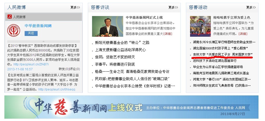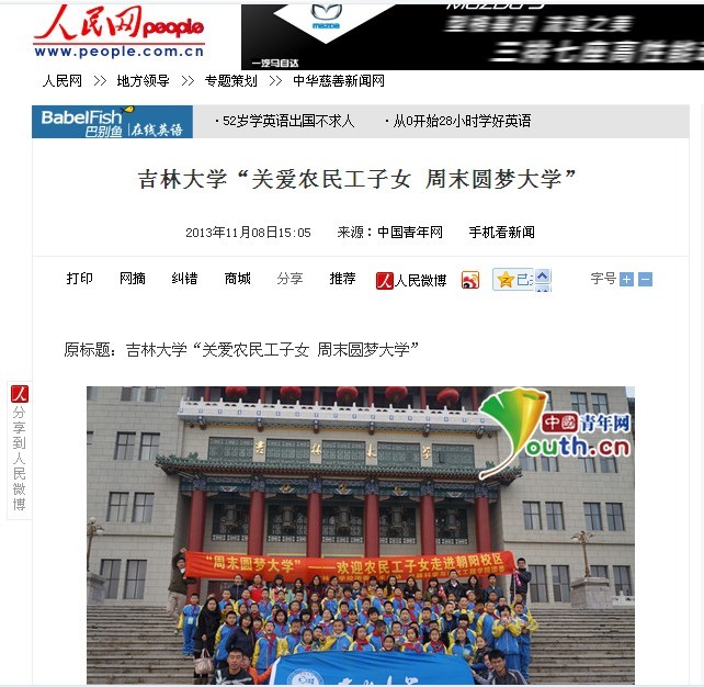 “关爱农民工子女 周末圆梦大学”》为题的详细报道后,在校内外产生了良好而广泛的影响,人民网、新民网、中华慈善新闻网等社会主流媒体和吉大新闻网等校内媒体对此进行了全文转载报道。