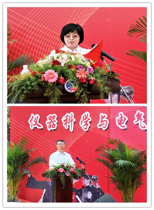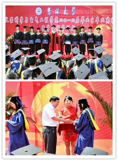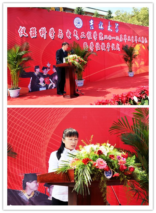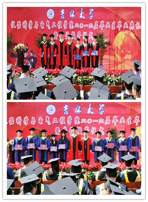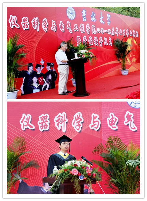 2013届研究生毕业生和本科毕业生名单,院长林君教授与院学位委员会主任田地教授一起为2013届毕业生授予学位。随后,院党委书记余国友教授宣读了2013届校、院优秀毕业生名单,并为优秀毕业生颁发获奖证书、合影留念。学院教学委员会主任王应吉教授宣读了优秀毕业论文名单,仪器系主任凌振宝教授、电气系主任刘长胜副教授分别为获得优秀毕业论文的同学颁发证书并合影留念。之后,教师代表朱凯光教授和2013届毕业生代表、成人网址