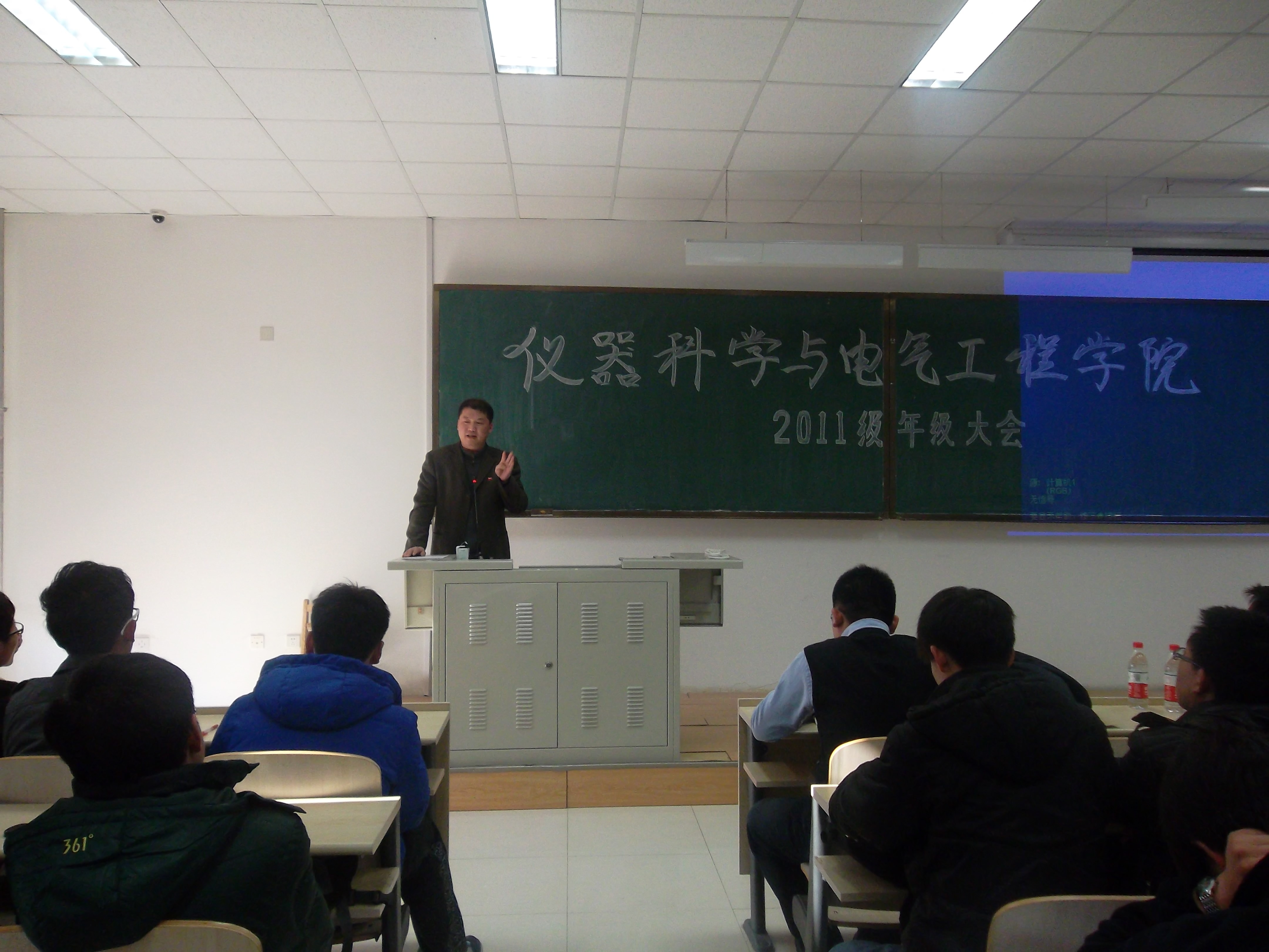 学生历年的获奖情况,他鼓励大家要积极地将专业知识与动手实践有机结合,他动员2011级全体同学积极参加到即将举行的校电子设计竞赛中,鼓励大家认真选题,大胆创新,力争在今年的校电子设计竞赛中再创佳绩。会后,各位领导和老师还耐心地与2011级同学进行了交流与沟通,针对同学们提出的问题给出了切实宝贵的意见。