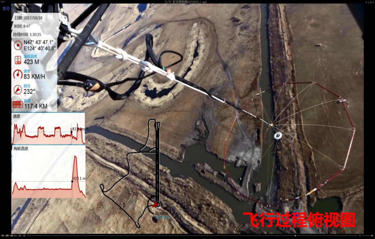 自行研制的软支架直升机吊舱式时间域航空电磁探测系统,在黑龙江省齐齐哈尔市富裕县首飞取得圆满成功。
