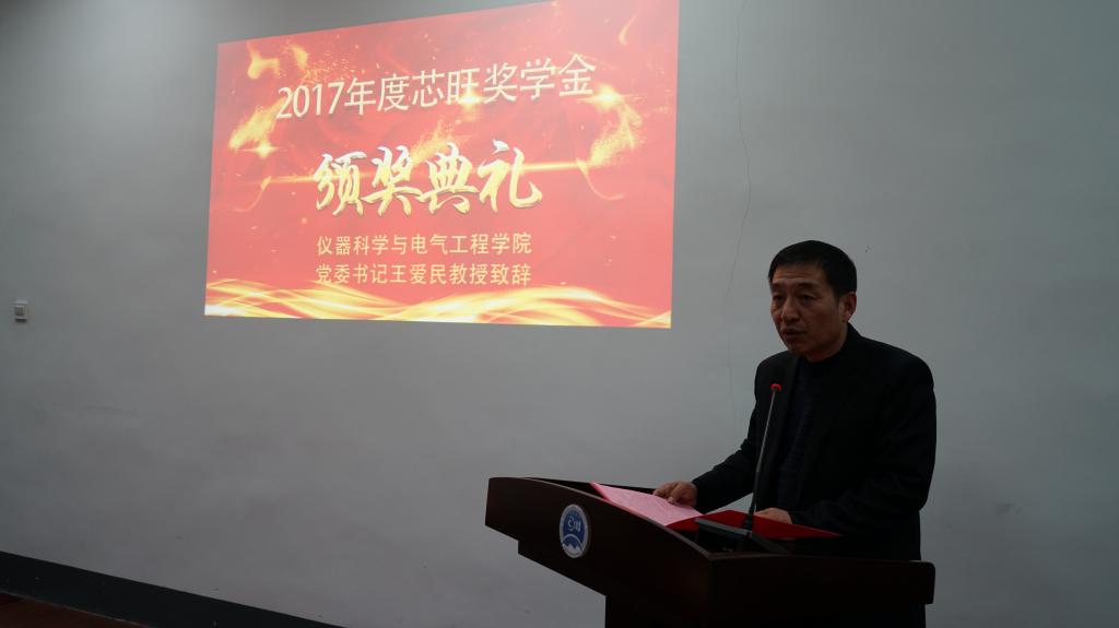 典礼最后,王爱民教授发表讲话,他首先对获奖学生表示祝贺、对捐赠企业表示感谢,而后结合十九大的教育内容,讲述了此奖学金设立的意义,并代表学院对同学们提出了感恩、理想、品德等方面的期望,希望他们弘扬仪电精神,为国家做贡献。在与会人员的高昂激情与热烈的掌声中,本次颁奖典礼落下帷幕。