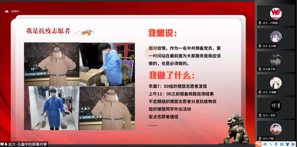 抗疫志愿者代表分享广大师生在抗疫过程中的先进事迹和宝贵经验。郝毅、王鑫宇、赵梦珂、胡玮桐同学分别从个人和集体两个角度出发,分享了在校园封闭管理期间的抗疫日记和志愿服务经历,吉大学子守望相助、封校不停学,学生党员积极投身防疫一线,践行着新时代青年的初心与使命。听完成人网址