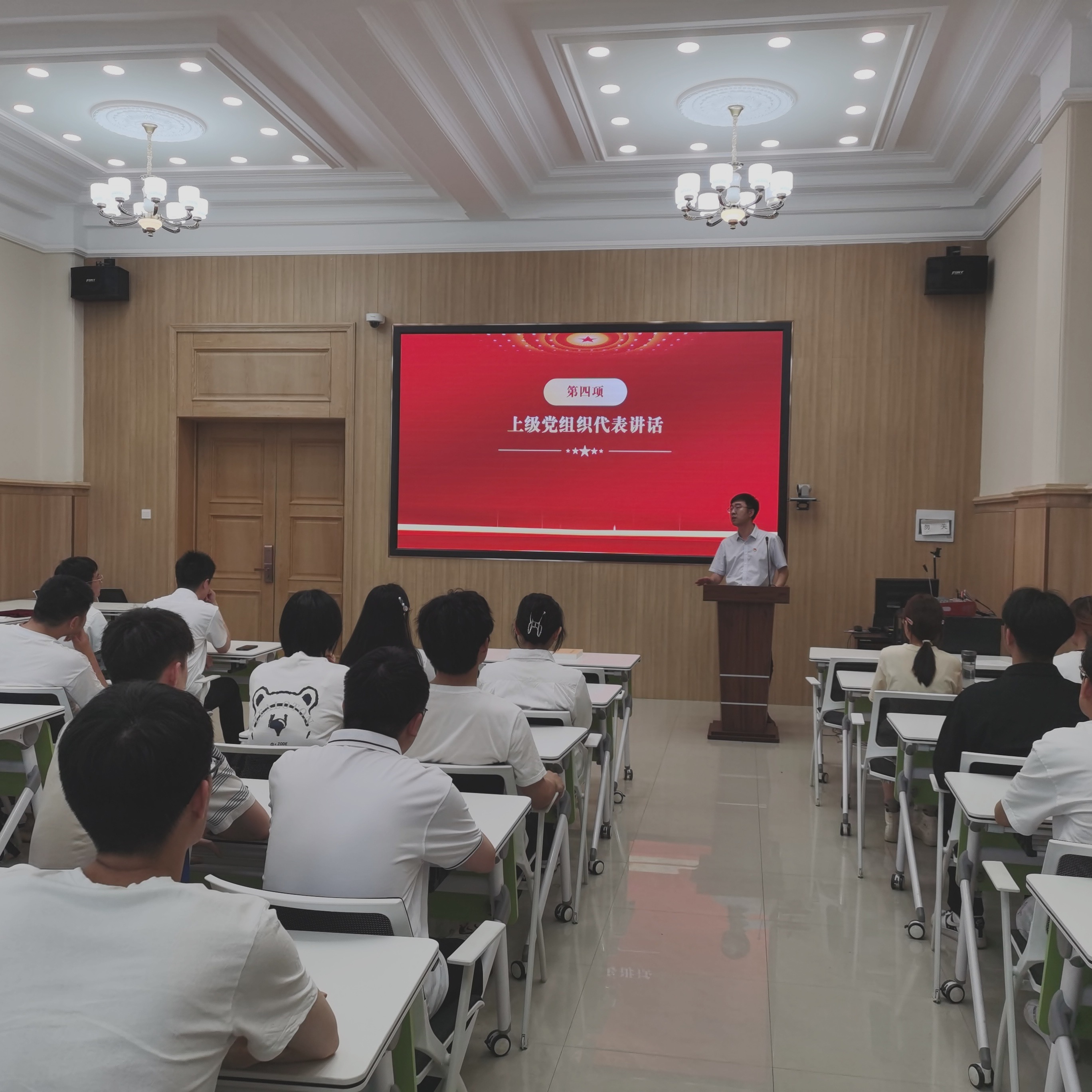 仪式上,全体师生党员共唱《国际歌》,在歌声中感受前辈的革命热情,用歌声展现青年的热血风貌。上级党组织代表周伟为13名新发展党员佩戴党徽,当庄严的党徽戴在胸前的一刻,全体党员的自豪感和荣誉感油然而生,肩上更多了一份沉甸甸的责任。