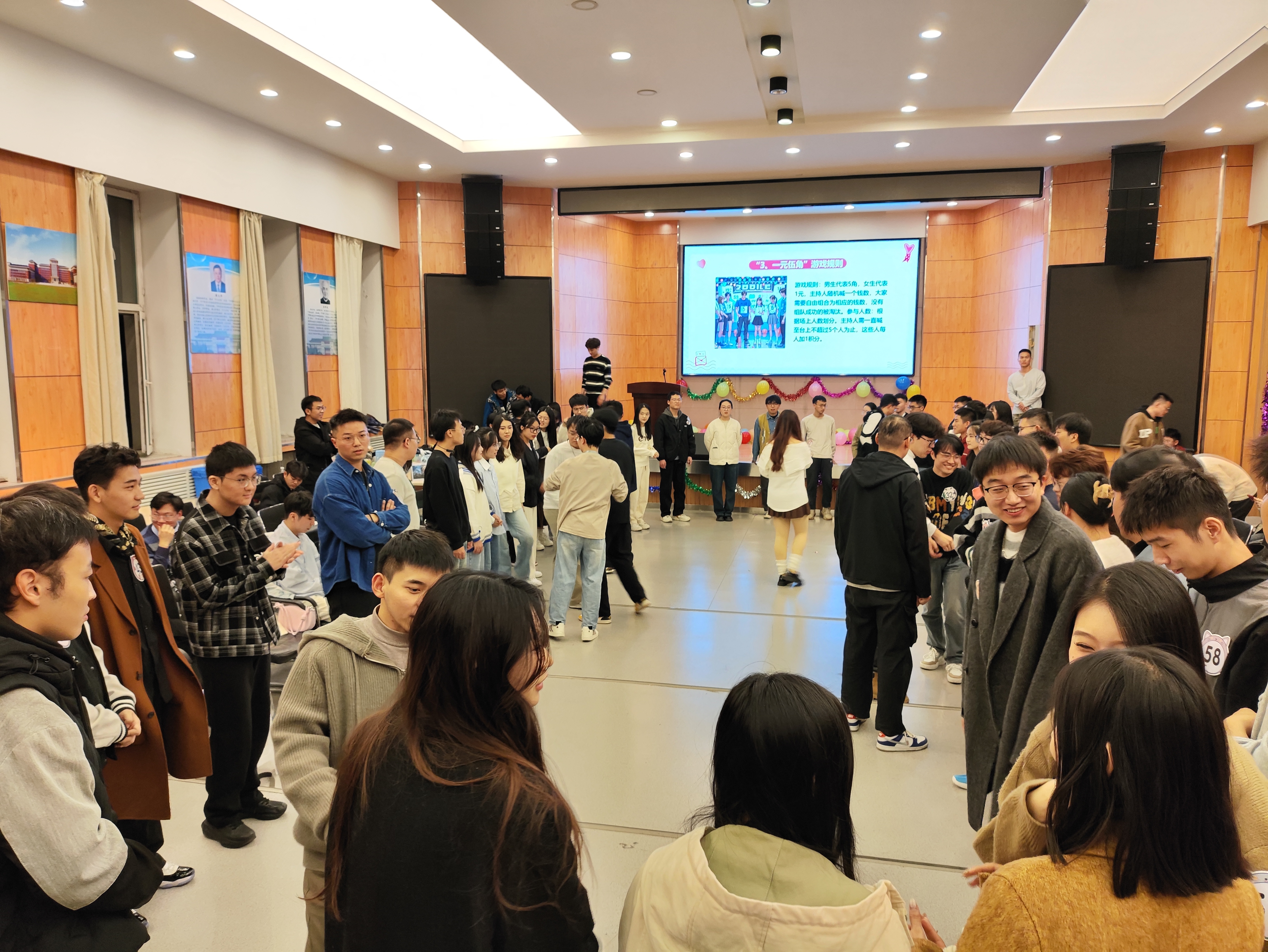 建设工程学院姜亚玲老师为活动致开幕辞,姜老师以幽默风趣的语言,对来自各个学院的同学表示了欢迎,为活动定下了轻松愉快的基调。随着破冰小游戏“击鼓传花”的进行,大家在欢声笑语中放下了紧张和拘束,彼此的距离被逐渐拉近,又开展了“答非所问”、“一元伍角”、“叠报纸”、“萝卜蹲”、“泡泡糖”、“气球保卫战”等小游戏。在游戏环节中,同学们挤满了整个会场,时不时引得现场观众捧腹大笑,现场充满了欢声笑语。部分同学还进行了才艺展示,歌声所展现的青春的活力引燃全场,会场氛围达到顶峰,观众们喝彩不断。