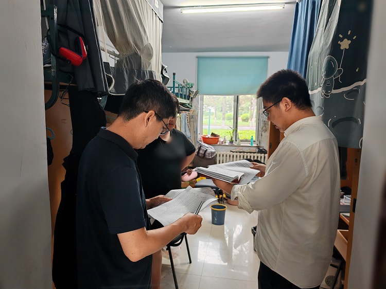 在朝阳校区学生一公寓、五公寓,各位老师逐一走访各毕业生寝室,核实毕业生离校情况,重点排查无人寝室断电情况。对于未离校的同学,老师们详细询问了原因及离校时间,强调了用电安全,提醒同学们离校前做好卫生清扫,合理处置闲置书籍、衣物等,离校前务必交还寝室钥匙,配合宿舍管理流程。
