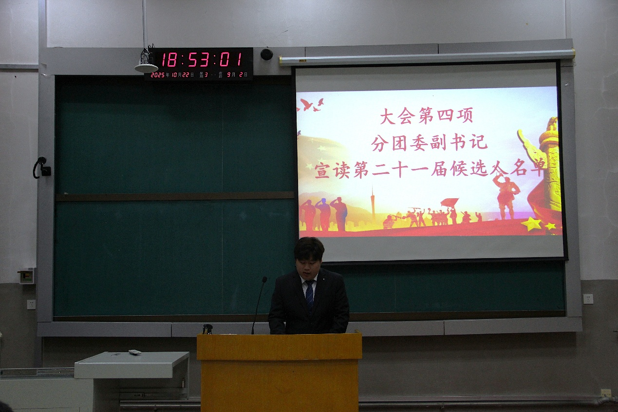 第二十届分团委副书记赵松硕宣读第二十一届团学组织主要学生干部候选人名单,按照竞选次序,候选人分别从个人履历、工作的认知与理解和未来工作展望三个部分上台竞聘演讲。