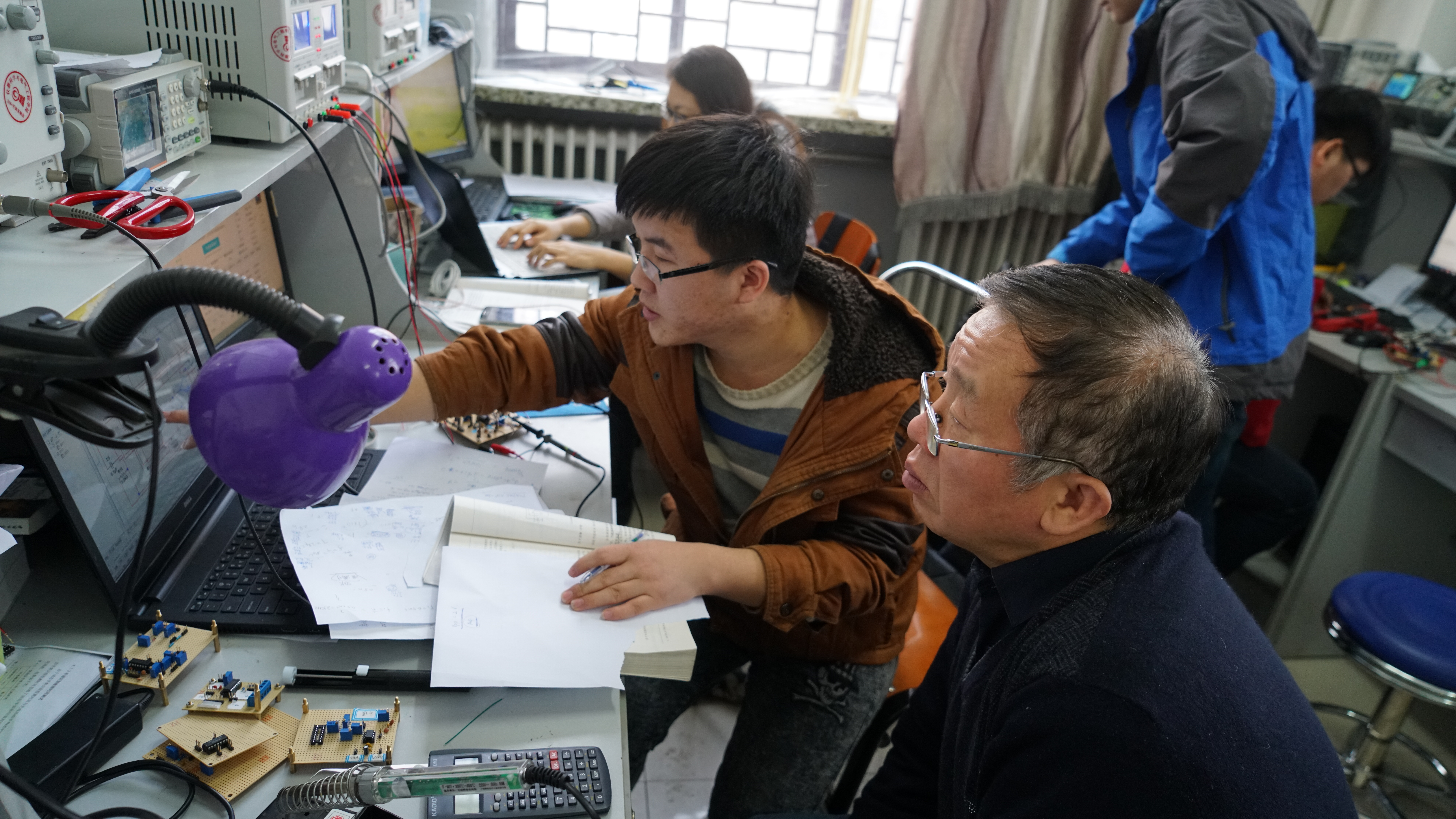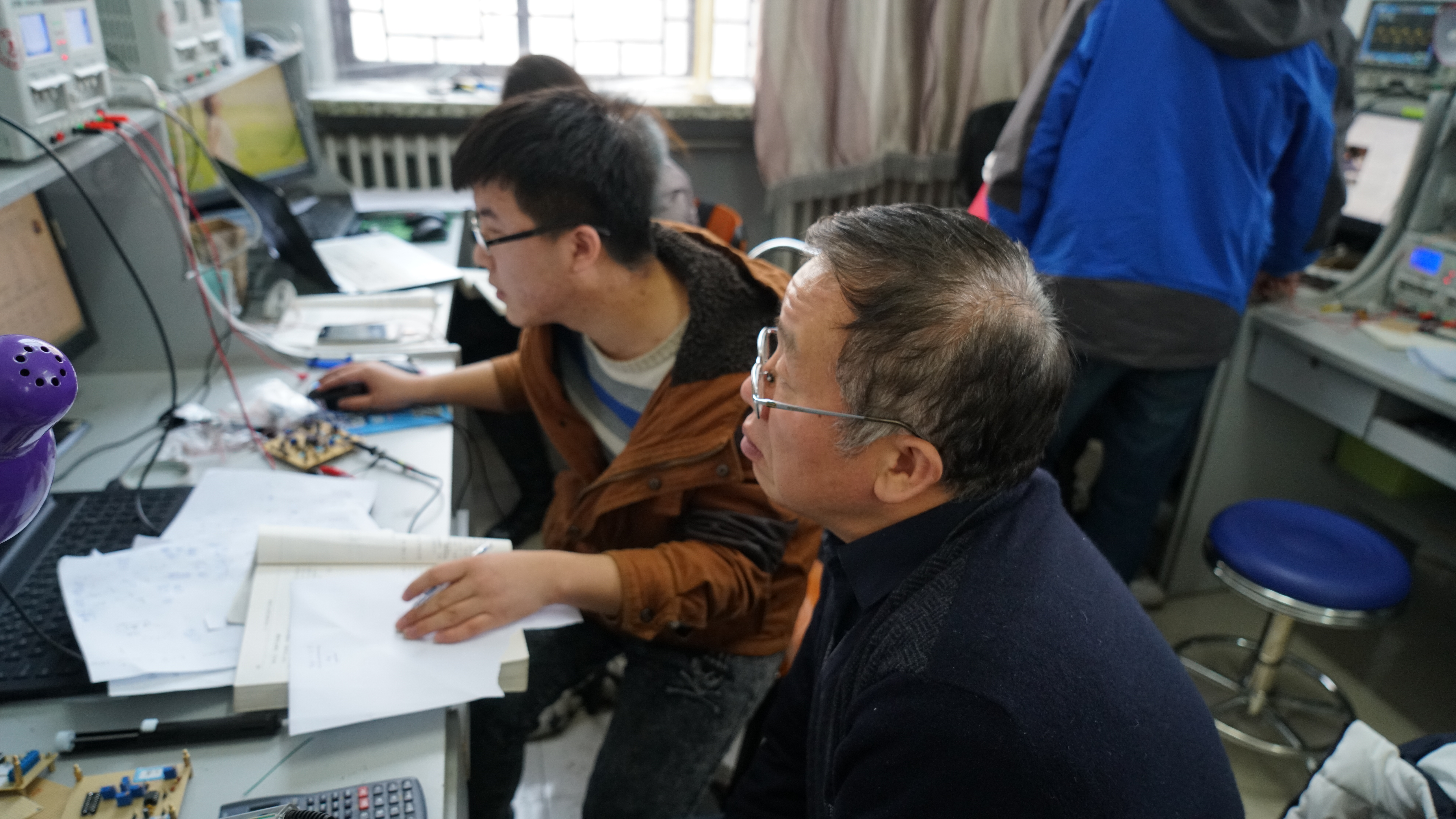 2017年1月15日下午,王世隆老师来到现场,检查了同学们2013年国赛综合测试题的电路图、仿真结果以及实图测试结果。检查过程中,王世隆老师针对每组同学出现的不同问题进行了相应的指导,还提出了一些问题考察同学们的理解程度,之后又对同学们共同出现的问题进行了相应的分析和指导。1月18日下午,同学们了提交设计报告,王老师又分别对各组的报告结果进行了单独的指导和分析,提出了改进方案,要求同学们第二天及时提交修改后的设计报告,并对每组的报告进行了评分,选出了最优组。
