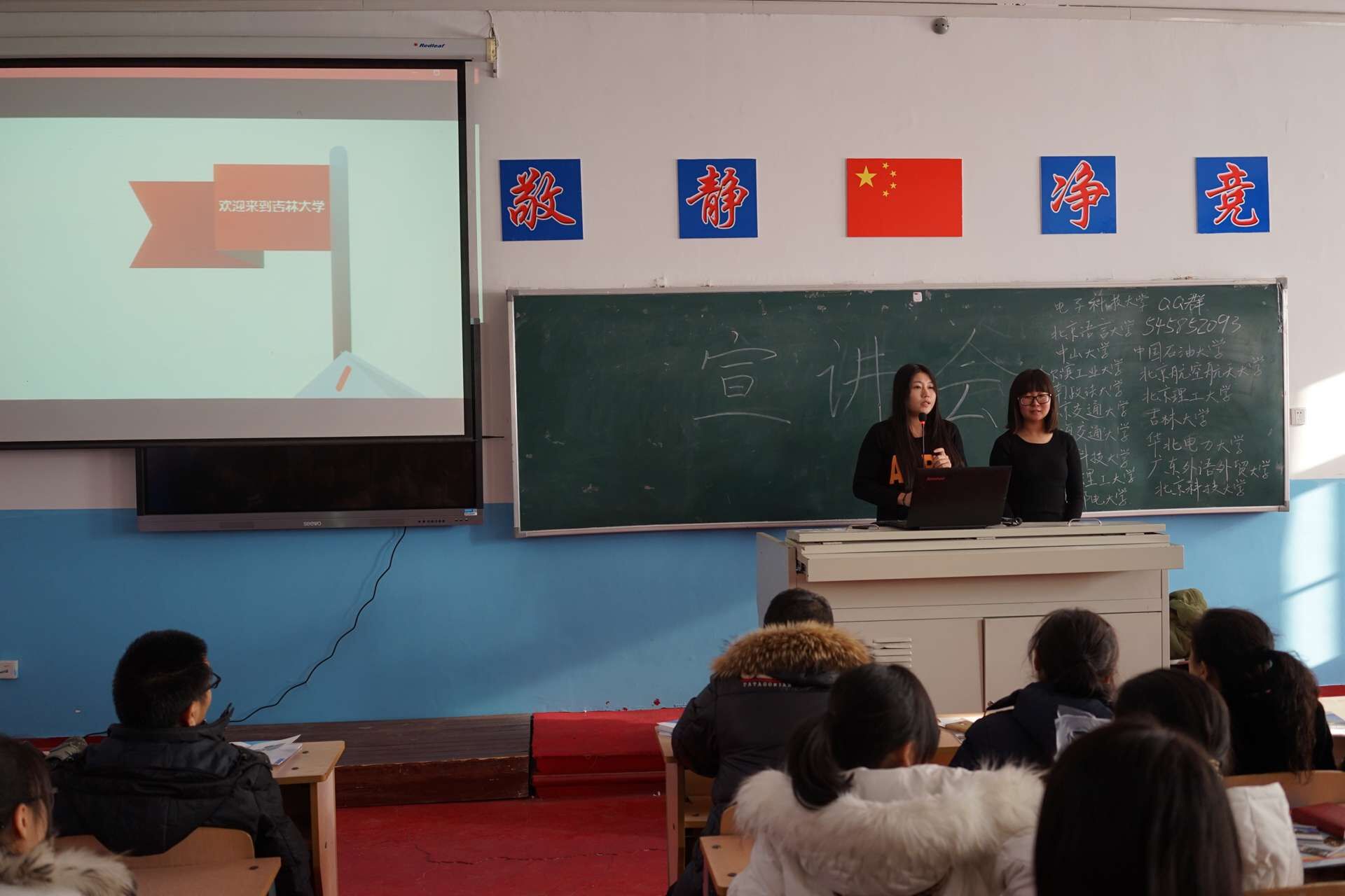 在2月13号中午12点,周帅宇同学及其团队成员来到四平市第一高级中学南楼一楼阶梯教室,在此之前他们已经联系好学校广播站为其宣传,同时在学校的显著位置张贴了海报。由于成功的前期宣传,致使去听讲宣讲会的学生与家长非常多。活动由主持人协调现场,主持人也是实践团队一员,在别的高校校友介绍完他们的学校后,成人网址