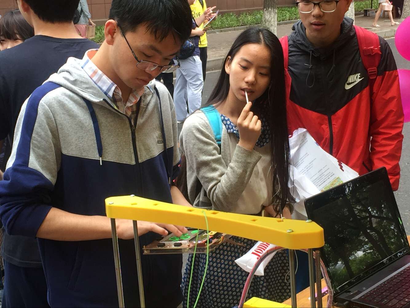 同学在电子设计大赛中的优秀科技作品吸引了过来。看着正在调试中的3D打印机、光控时控调光玻璃、等离子音响、自平衡小车等出色的作品,大家十分好奇,更多的还是惊叹。这些制作精美、创意十足的电子设计作品,让同学们和市民朋友感受着世界的新奇和科技的魅力。上午11点,嘉年华活动正式开始。电子科技协会的帐篷前马上便围满了慕名前来的吉大师生和市民朋友,大家都好奇地向科协的同学们提出自己的问题。科协成员一一为大家展示每个作品的功能,耐心地回答大家提出的问题。本次活动还准备了互动环节,各位游客既可以选择列举自己所了解的电子设计领域中常见的10种基本元器件名称,也可以来用DIY电子琴演奏一首自己熟悉的曲目等等。在科协的同学们的提示和帮助下,同学们都在收获新知识的快乐中完成了任务,并都满意地给电子科技协会点了大大的赞。