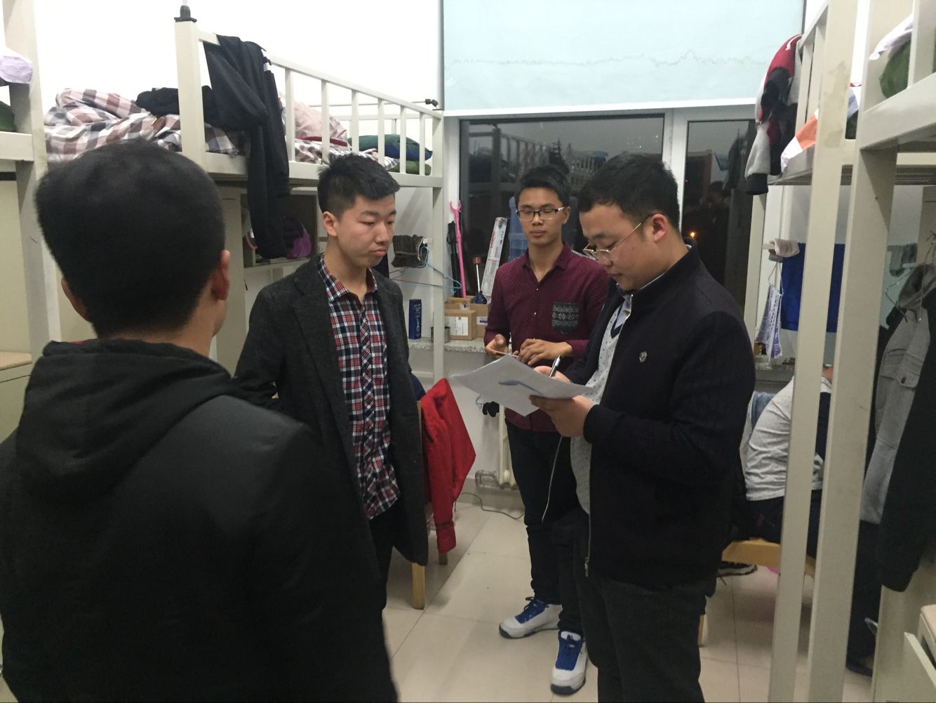 2015级辅导员与学生会生活部相关人员对北苑一公寓中的2015级寝室进行了本学期第2次联合检查。此次安全卫生检查包括以下内容:室内有无私拉乱接电源电线和使用违章电器行为;室内是否干净整洁,生活用品摆放整齐;门窗是否洁净,有无附着灰尘等9项检查指标。检查过程中,张昊宇老师和学生会生活部相关人员对各个寝室安全卫生情况进行了评分,张老师对卫生干净整洁、装扮优雅美观的寝室进行了表扬;对存在的问题的寝室提出了整改方案。他号召大家将寝室作为自己的小家,像对待家人一样对待自己的同学,营造出温馨融洽的寝室氛围。本次检查共历时1个小时,通过寝室检查可以发现,2015级寝室无私拉乱接电源电线和使用违章电器行为,地面基本洁净,整体状况良好。但仍普遍存在窗台堆积杂物、附着灰尘等问题,个别寝室不注意通风,造成室内空气不清新的情况。