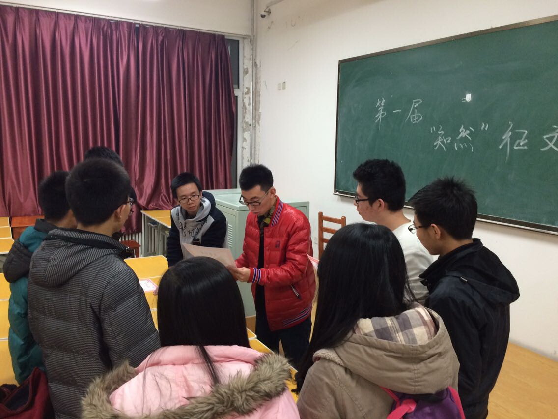 团委新闻通讯社于2014年4月18日在中心校区李四光楼308室举办了第一届“知然”征文比赛的颁奖典礼,学院全体学生会成员参加了本次活动。