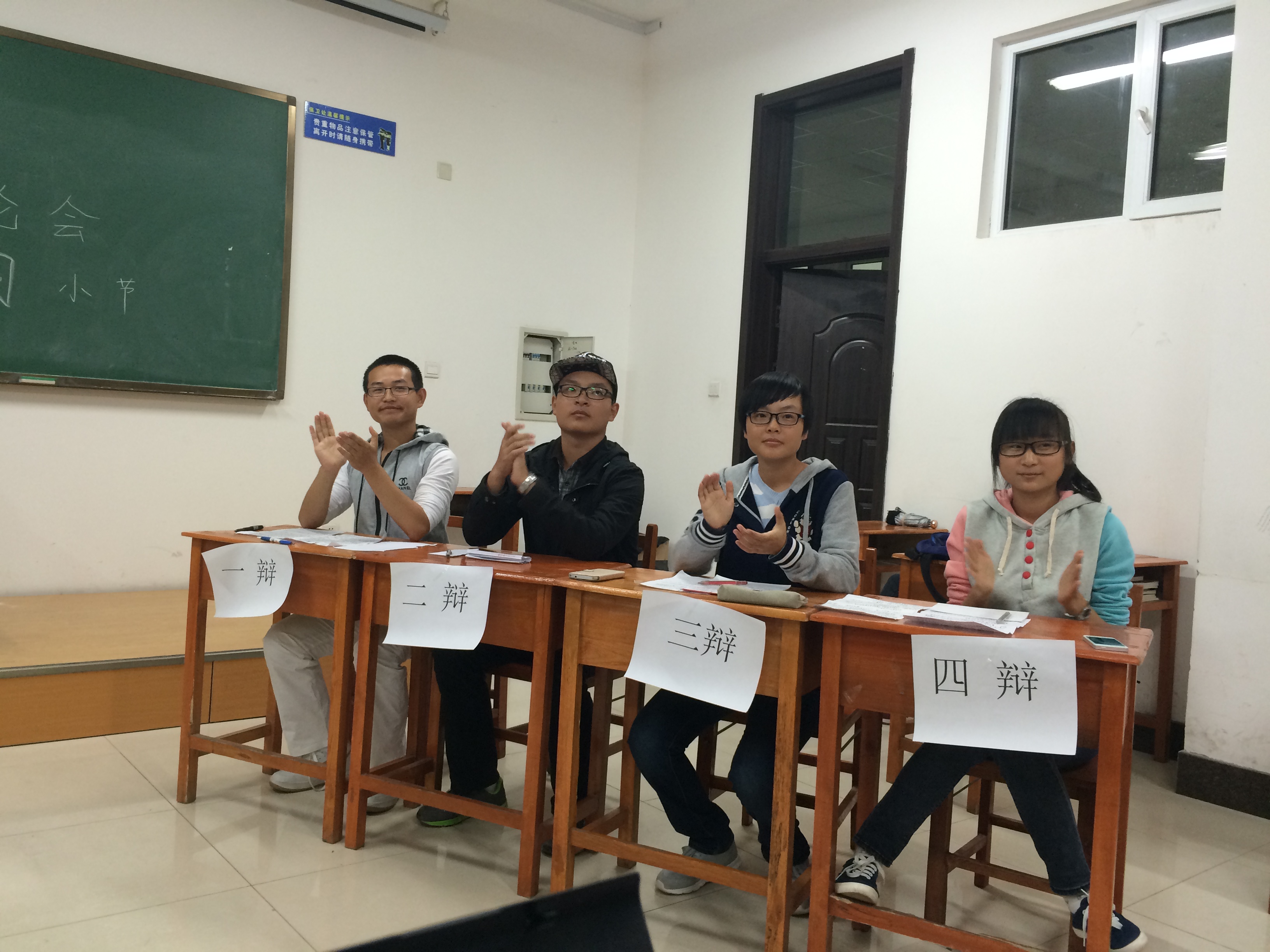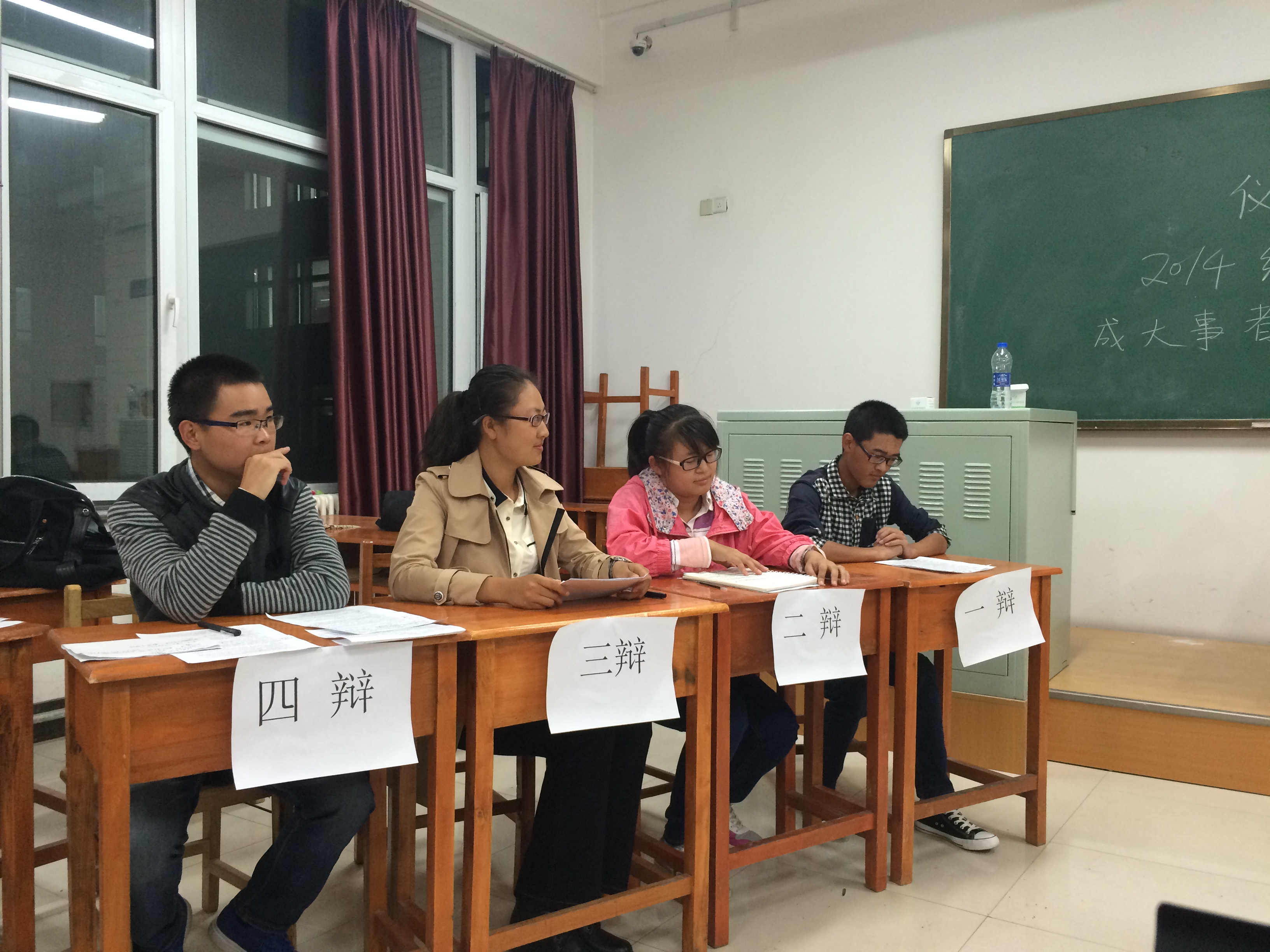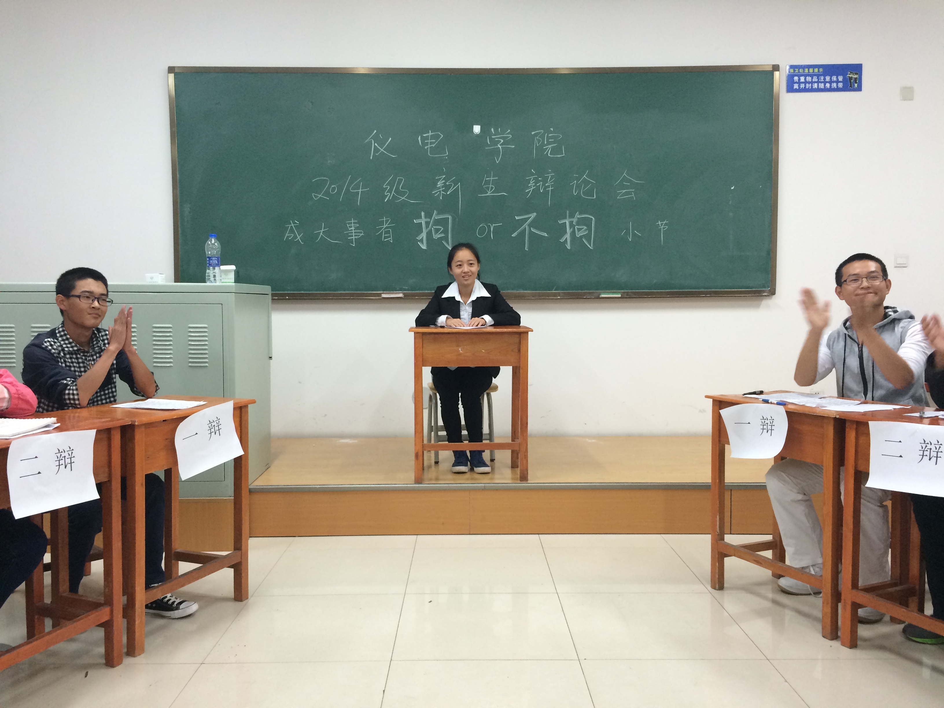 学生会举办的“Power Speaking新生辩论赛”第二轮最后一场比赛于2014年10月21日晚在李四光318教室举行。本场比赛由“Power Speaking”协会成员担任评委及主持人,辩题为“成大事者拘or不拘小节”。