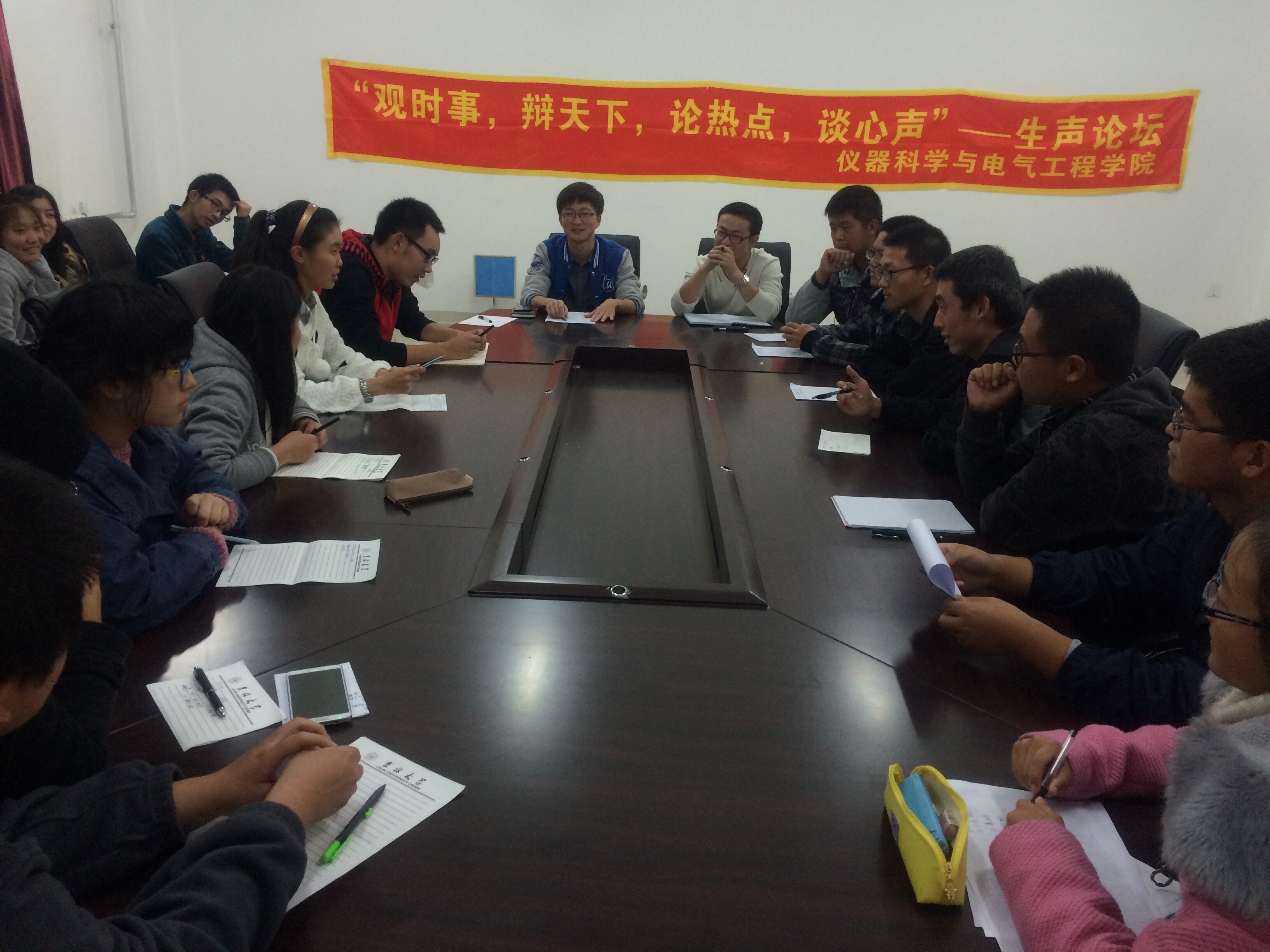 团委组织策划了“生声论坛”系列活动。2014年10月26日,第十四期“生声论坛”活动以“专业知识学习和学生社团工作哪个更重要”为主题在中心校区李四光实验楼举行,参加本期论坛的有第十届学生会秘书部以及学习部的全体成员。