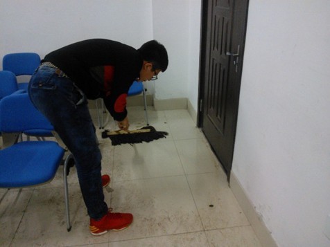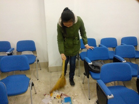 当晚八点左右,志愿者们来到了中心校区李四光实验楼,在负责人为大家布置好工作任务后,志愿者们便迅速投入到义务劳动中来。有的同学用扫帚细心地将垃圾扫到一起,有的同学负责拖地,剩下的同学或摆放桌椅,或擦黑板,没有人嫌脏,没有人说累,大家干得热火朝天,经过两个多小时的奋斗,实验室终于变得干净整洁。看着满满的垃圾袋,大家都开心地笑了,最后大家合影留念,圆满的结束了这次忙碌但有意义的志愿服务活动。
