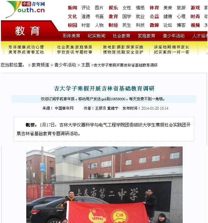 大学生寒假社会实践团在院团委书记朱宇带领下开展的吉林省基础教育调研活动受到了共青团中央主办的中央重点新闻网站——中国青年网的关注报道,中国青年网于1月20日以《吉大学子寒假开展吉林省基础教育调研》为题做了详细介绍。