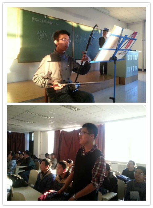 学子积极向上、朝气蓬勃的青春风采。随后,主持人尤鹤鸣致开场词,他以一个大一新生的角度从学业、生活、情感、就业等各方面阐述了在实现自己“大学梦”的过程中所遇到的阻碍,同学们也积极发言,各抒己见畅谈了自己大学四年的规划和目标。接着,陈晓津同学为大家带来了唯美动人的精彩独唱,而周琪同学为大家表演的二胡独奏更是余音绕梁。随后,2013级一班全体同学上台齐声共唱他们的班歌——《爱因为在心中》,温馨有爱的歌声将此次班会活动推向高潮。最后,蔡印老师为本次班会做了精彩的点评和总结,蔡老师勉励大家要努力学习,珍惜时间,为实现自己的“大学梦而努力奋斗!