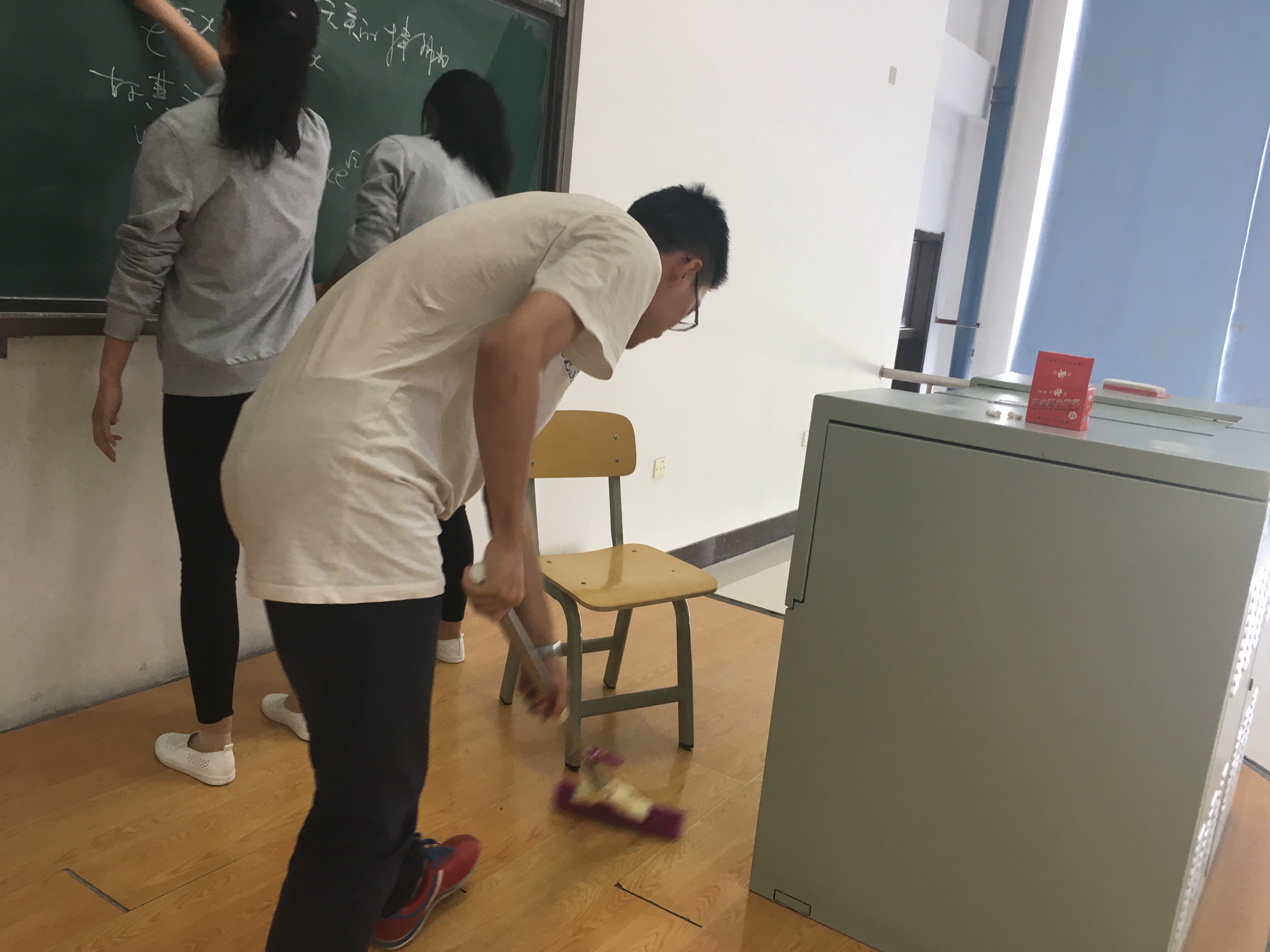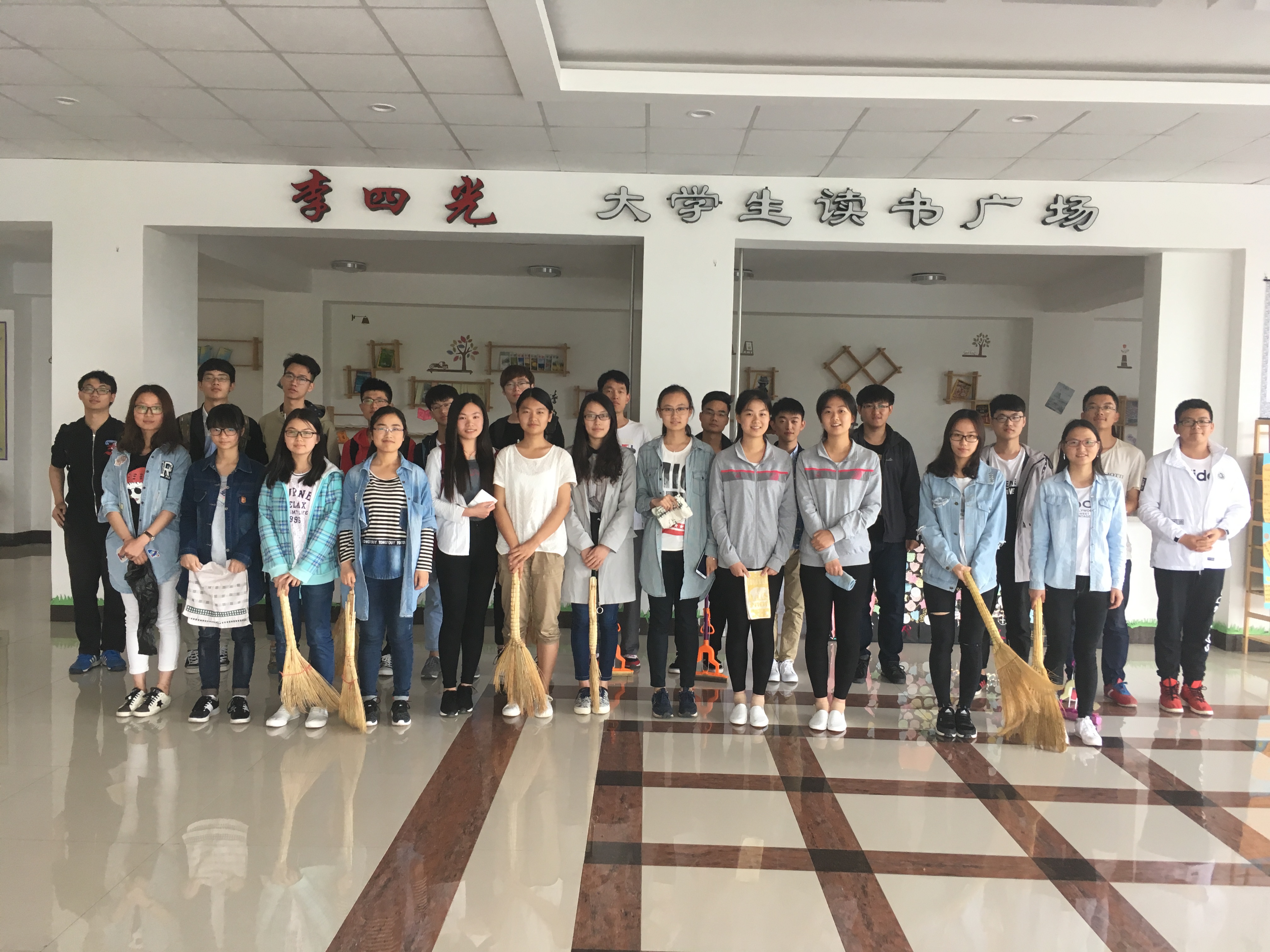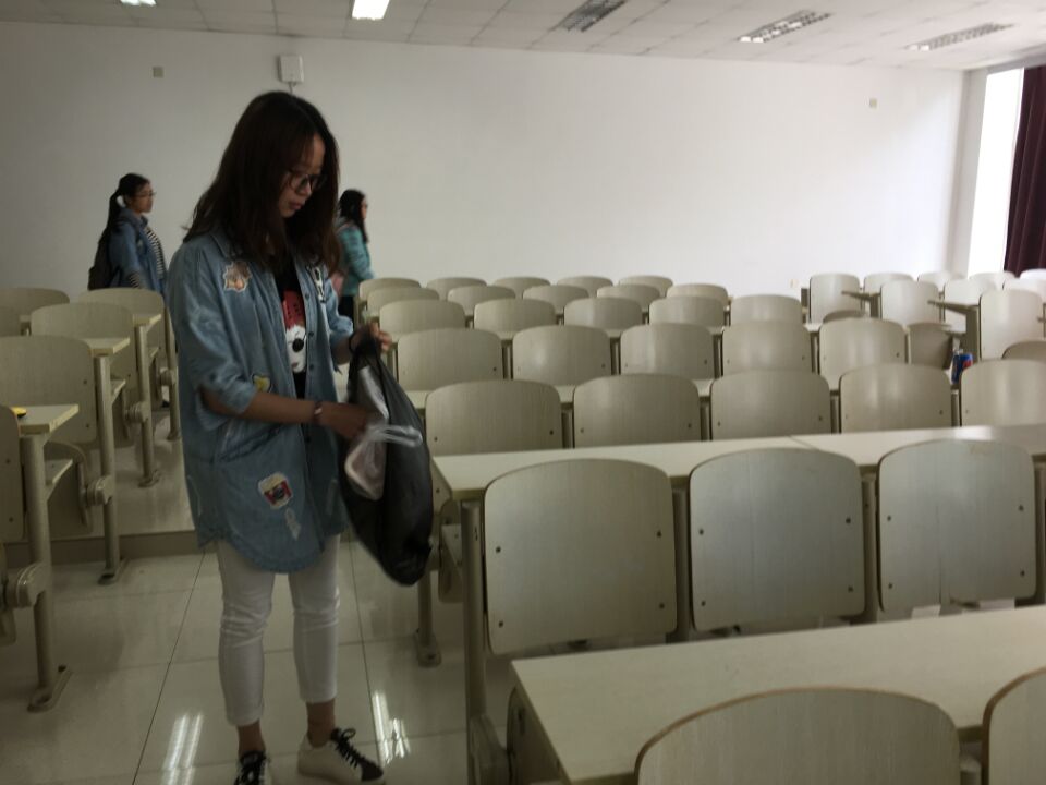 上午11:40下课后,大家准时在李四光教学楼二楼图书广场集合。按照预先的安排,各班的入党积极分子分别带来了抹布、扫帚、拖布和垃圾袋等清洁工具。首先,大家找到常规打扫所不能照顾到的死角,积极讨论打扫范围,进行人员分配,划分打扫任务,随后带着各自的打扫工具,开始分散去李四光各个楼层、各间教室进行清洁工作。大家很快投入到义务劳动之中,扫地、拖地、擦窗台、擦黑板、捡垃圾……清扫过程中,各小组成员间配合默契,用心完成此次任务。30分钟后,活动接近尾声,所有人略显疲惫。最后,每个人收拾好各自的清洁工具,合影留念。