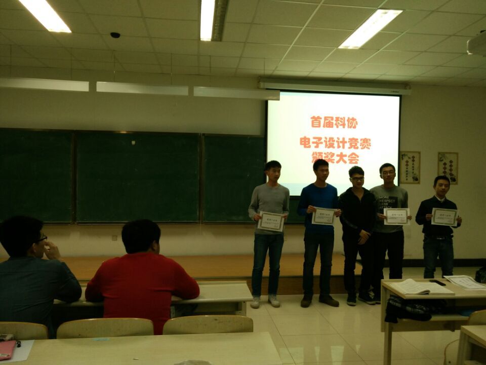 在李四光楼302教室举行了电子设计竞赛颁奖仪式,颁奖仪式由电子科技协会副主席周葛主持,分团委副书记于一兵,学生会主席岳良广以及电子科技协会副主席张思雨出席了本次仪式,2015级全体新生参加了本次仪式。