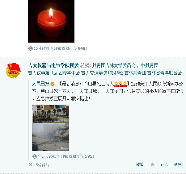 团委运用微博、人人网等新媒体工具第一时间向学院青年师生发布灾区信息,各班级团支部利用微博等关注灾情,广大青年学生在网络上第一时间向四川雅安地震灾区传递祝福。