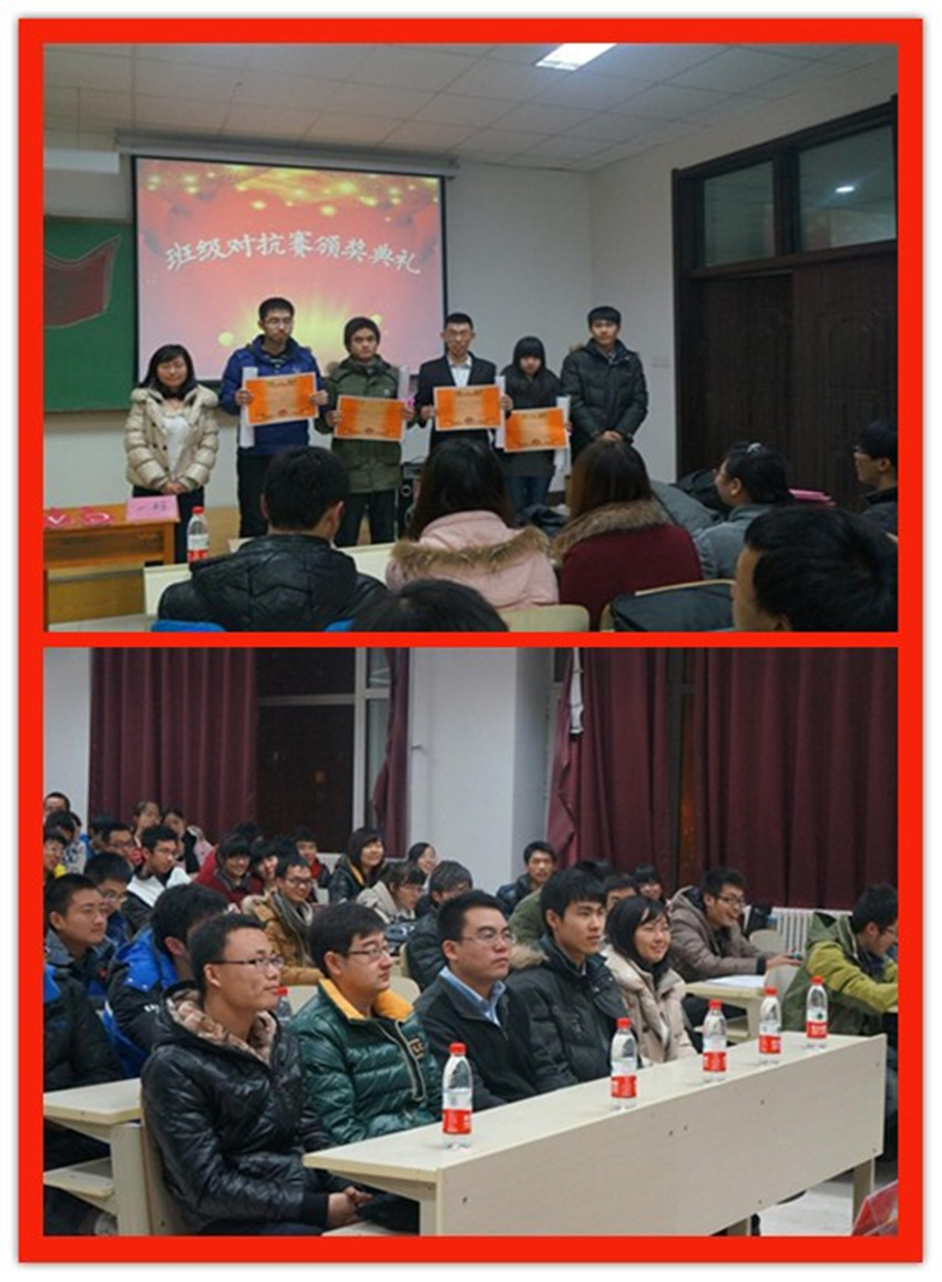 第八届分团委、学生会于2012年10月至12月开展了兄弟班级对抗赛系列活动。2012年12月13日晚,兄弟班级对抗赛颁奖典礼暨总结表彰大会在中心校区李四光楼210室举行。院团委副书记兼2011级辅导员朱宇、2012级辅导员蔡印、第八届分团委副书记李娇阳、学生会主席朴冠宇及分团委、学生会全体学生干部出席了活动,2012级全体新生同学参加了活动。