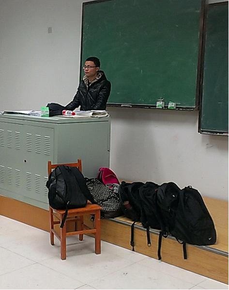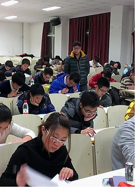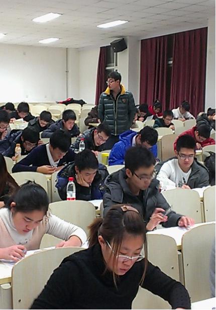 分团委学生会学习部组织2012级新生在中心校区李四光楼进行期末模拟考试。2012级辅导员蔡印老师、学生会各部部长来到考场进行监考工作。