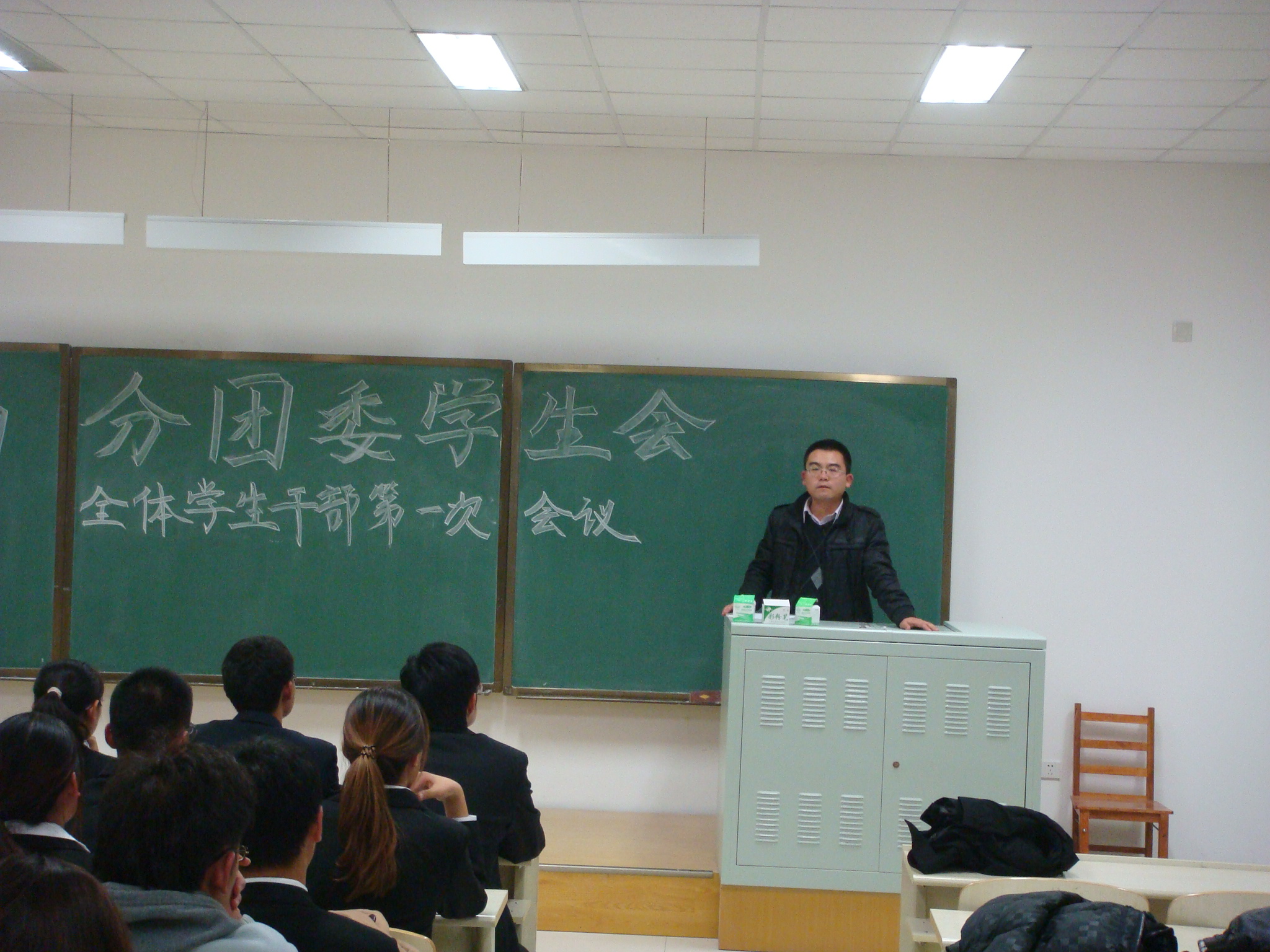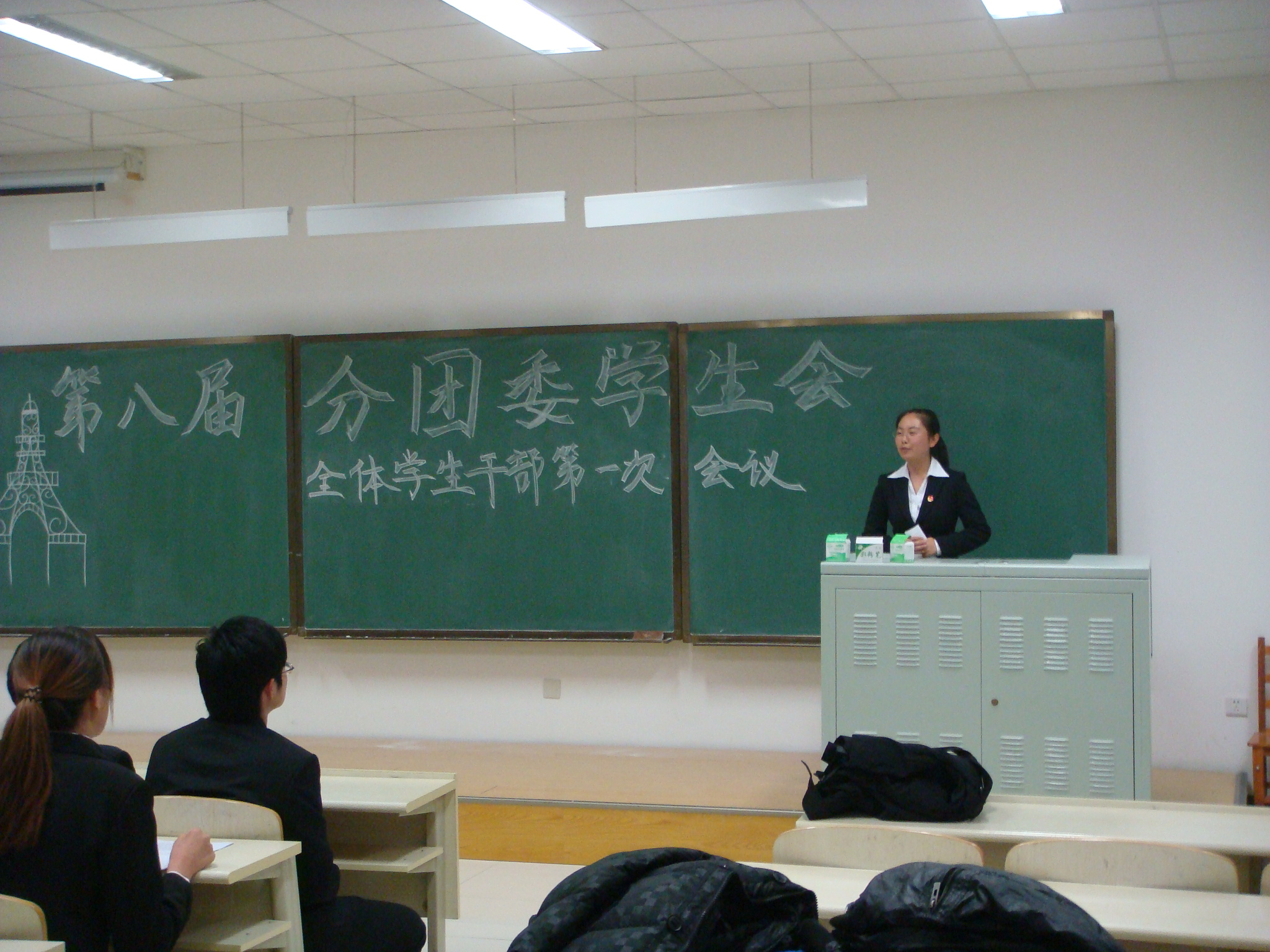 在中心校区李四光楼306教室召开了学院第八届分团委、学生会启动大会暨第一次全体学生干部会议。学院团委副书记兼2011级辅导员朱宇、第八届分团委副书记李娇阳、学生会主席朴冠宇、常务副主席任广安、副主席王洪超、各部部长及2011级全体副部长参加了会议。