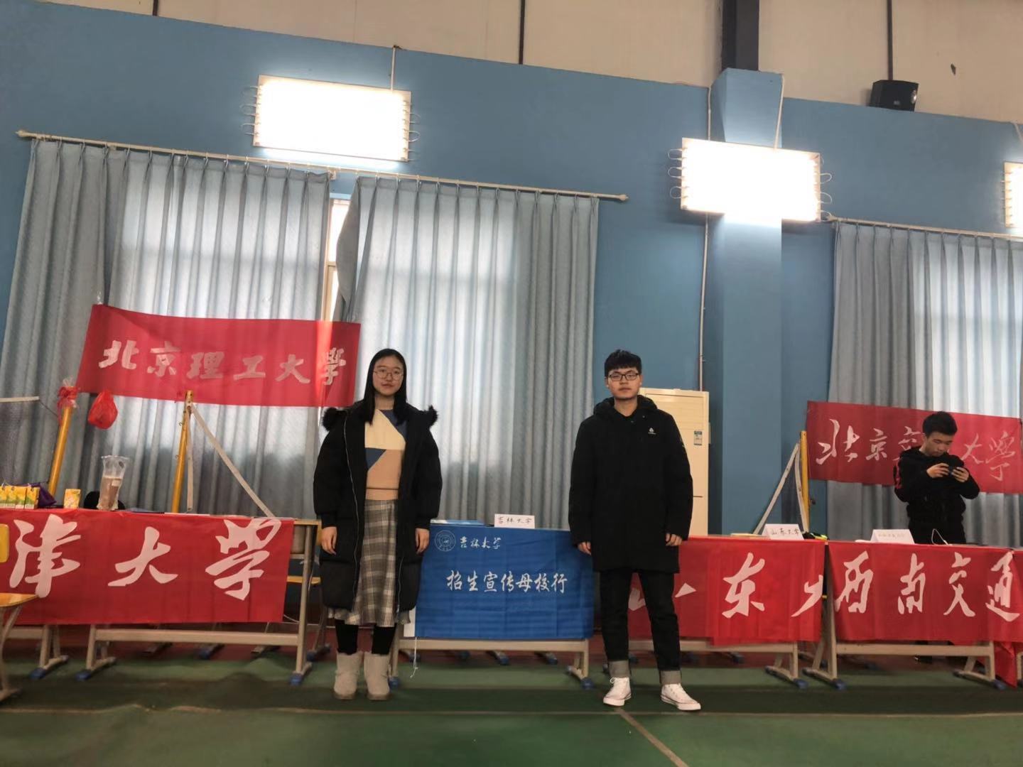 1月25日下午1:30,宣讲团队在莲塘第一中学提供的场地下,与来自全国各地的二十余所高校共同举办高校咨询会摆摊宣讲活动。彭博和卞思宇给到场的学弟学妹们发放了成人网址