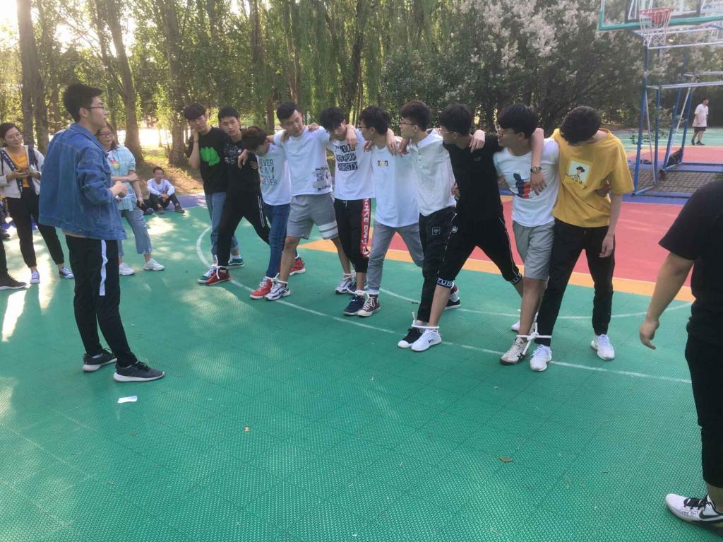 活动当天正值初夏,虽然天气炎热,但同学们情绪依然十分高涨。各方阵同学在篮球场集合后,负责人组织同学们有序站好,开始热身活动,使大家放松心情,为接下来的各项游戏做好充分的准备。首先,各方阵分别进行123看着边、引路人、传篮球、解手链和人椅破冰几个游戏项目,每一个项目都是对同学们综合素质的考察。123看这边游戏增强了对同学们的反应能力和应变能力;引路人游戏不仅加强了同学们的语言表达能力,还加深了同学们对彼此的信任;而传篮球游戏使大家产生了强烈的集体责任感;解手链游戏展现出同学们的聪明才智;在人椅破冰游戏中,每一个人都十分重要,离开任何人的努力都无法完成游戏,这是对同学们团队精神的考验。经过这几个游戏,各方队的同学们拉进了彼此的关系,产生了强烈的团体意识,真正地成为了一个团队。