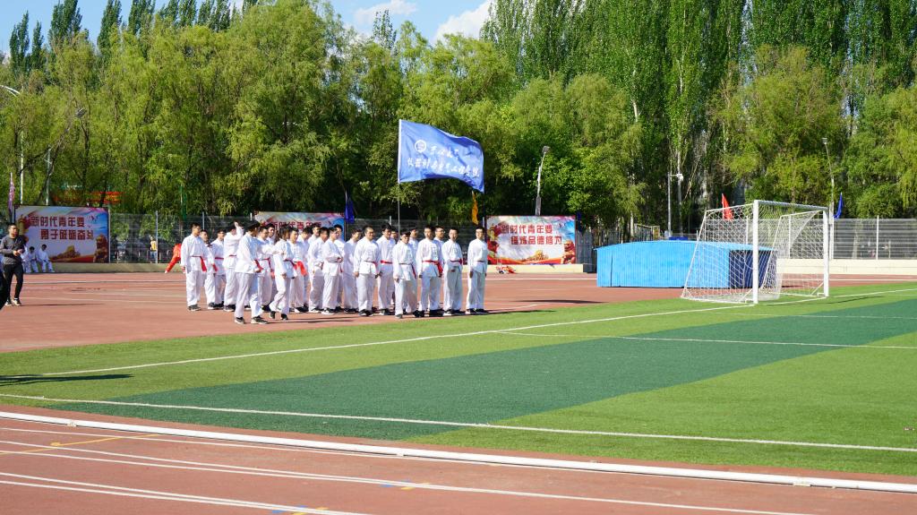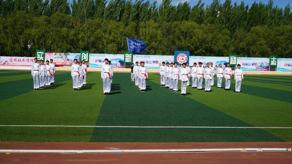长拳队伍于第三组上场。伴随着长拳音乐响起,同学们步履一致,动作刚劲有力。白衣随着清风飘舞,汗水从同学们额头滴落,但他们的眼神依旧坚定,展现着仪电学子的风采。