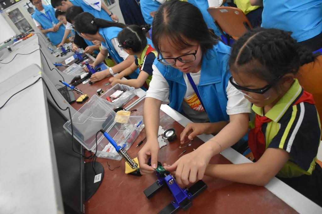 活动开始,小朋友们在志愿者的带领下先观看了活动简介以及安全教育短片,接着在志愿者的介绍下认真欣赏了“蜘蛛侠机器人”、四驱车、无人机、头盔型直升飞机等科技作品,最后就是最有趣的动手制作环节了。实验室提前为孩子们准备好了使用的工具、安全防护用具护目镜、围裙等,小朋友们佩戴好护目镜,穿好工作服,在志愿者的陪同下亲自动手制作了一个炫酷小音箱。活动过程中,小朋友们和志愿者团结协作,气氛融洽,志愿者们全神贯注地进行教学,每个小朋友们的脸上都露出了满意的笑容。在制作结束后,志愿者为小朋友们颁发了结业证书并与小朋友们合影留念,活动在欢声笑语中圆满结束。